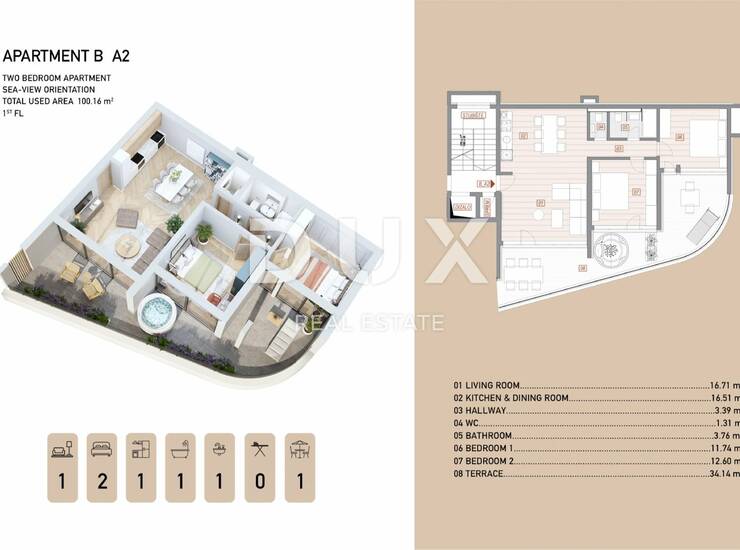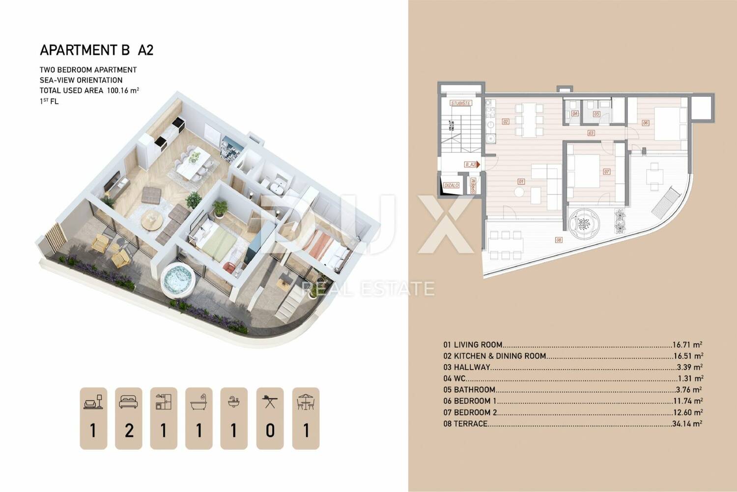 Ovaj ekskluzivni projekt sastoji se od dvije moderno dizajnirane zgrade, savršeno uklopljene u mediteranski pejzaž, a svaka zgrada sadržavat će šest stanova različitih kvadratura (od 48 m² do 240 m²). Posebnu vrijednost predstavljaju penthouse stanovi s panoramskim pogledom, kao i stanovi u prizemlju s privatnim terasama i vrtovima. Svaka jedinica pruža neometan pogled na Kvarnerski zaljev.