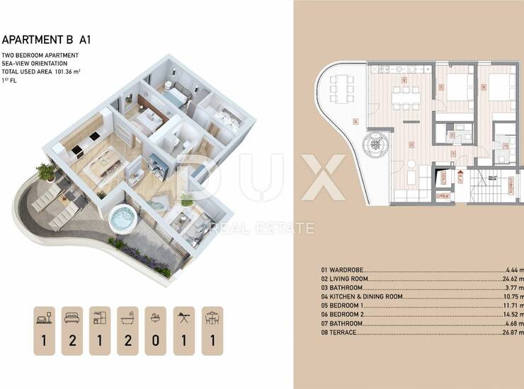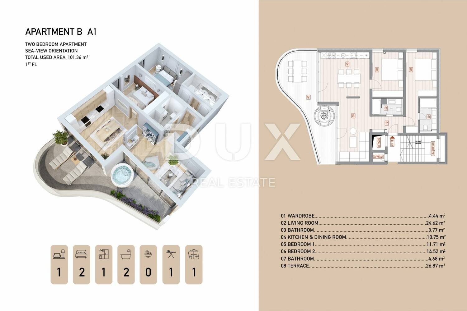 Ovaj ekskluzivni projekt sastoji se od dvije moderno dizajnirane zgrade, savršeno uklopljene u mediteranski pejzaž, a svaka zgrada sadržavat će šest stanova različitih kvadratura (od 48 m² do 240 m²). Posebnu vrijednost predstavljaju penthouse stanovi s panoramskim pogledom, kao i stanovi u prizemlju s privatnim terasama i vrtovima. Svaka jedinica pruža neometan pogled na Kvarnerski zaljev.