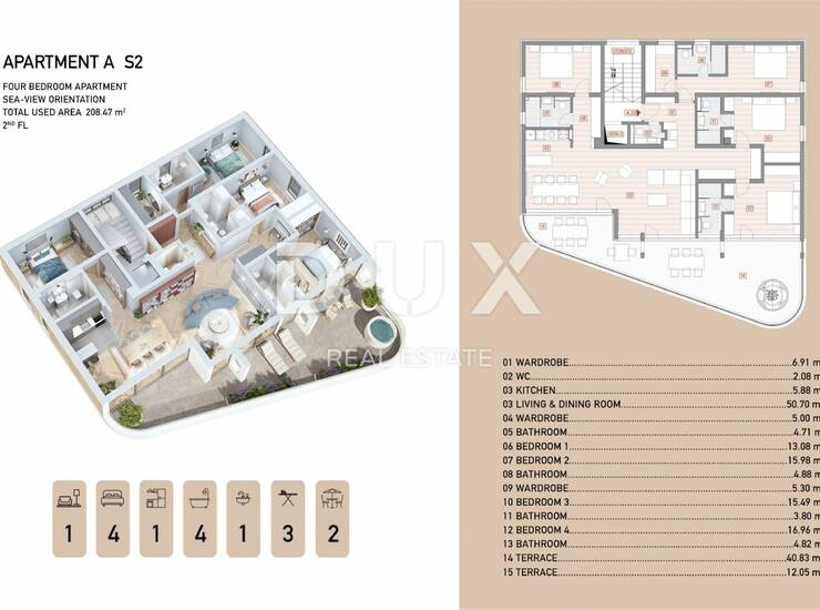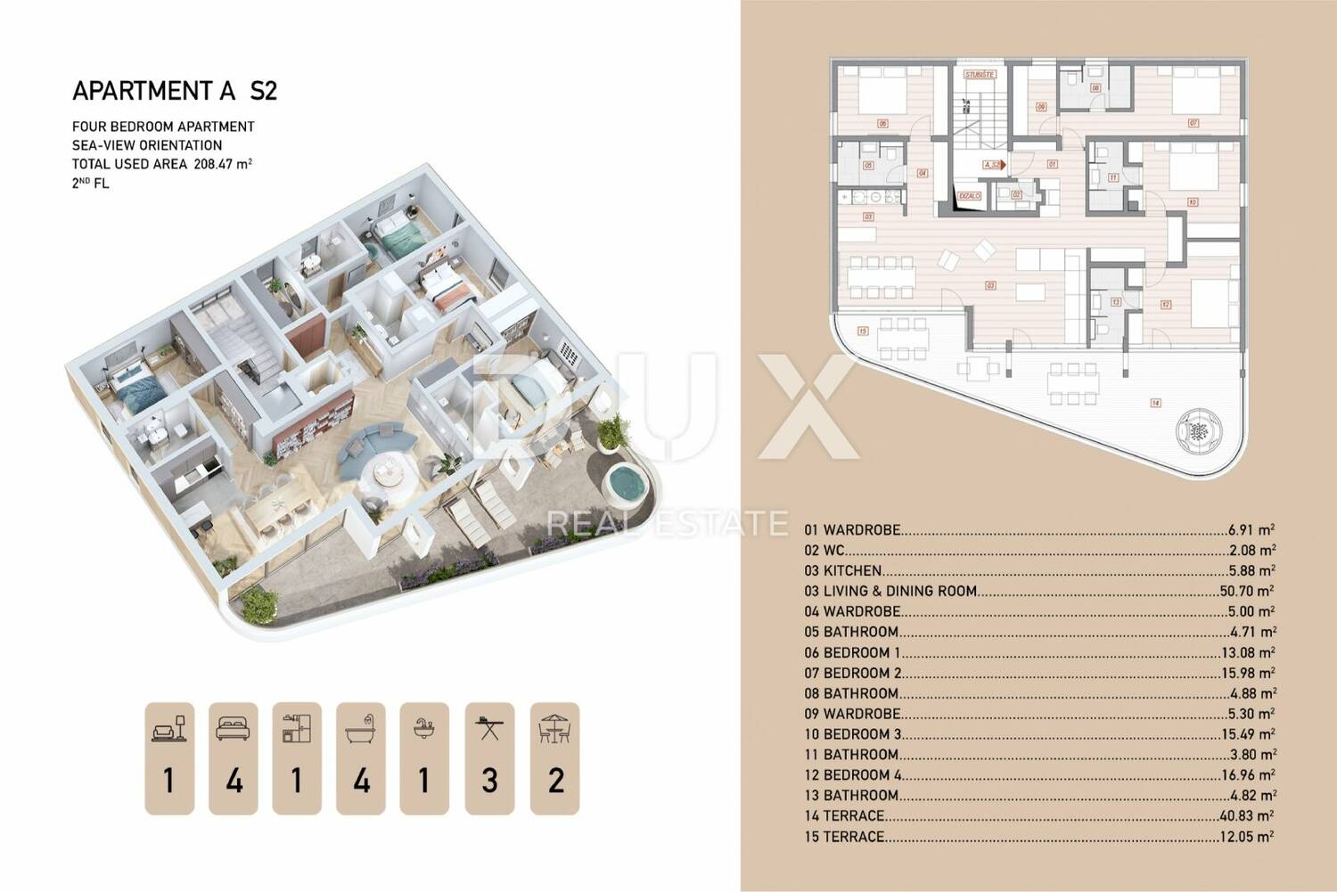 Ovaj ekskluzivni projekt sastoji se od dvije moderno dizajnirane zgrade, savršeno uklopljene u mediteranski pejzaž, a svaka zgrada sadržavat će šest stanova različitih kvadratura (od 48 m² do 240 m²). Posebnu vrijednost predstavljaju penthouse stanovi s panoramskim pogledom, kao i stanovi u prizemlju s privatnim terasama i vrtovima. Svaka jedinica pruža neometan pogled na Kvarnerski zaljev.