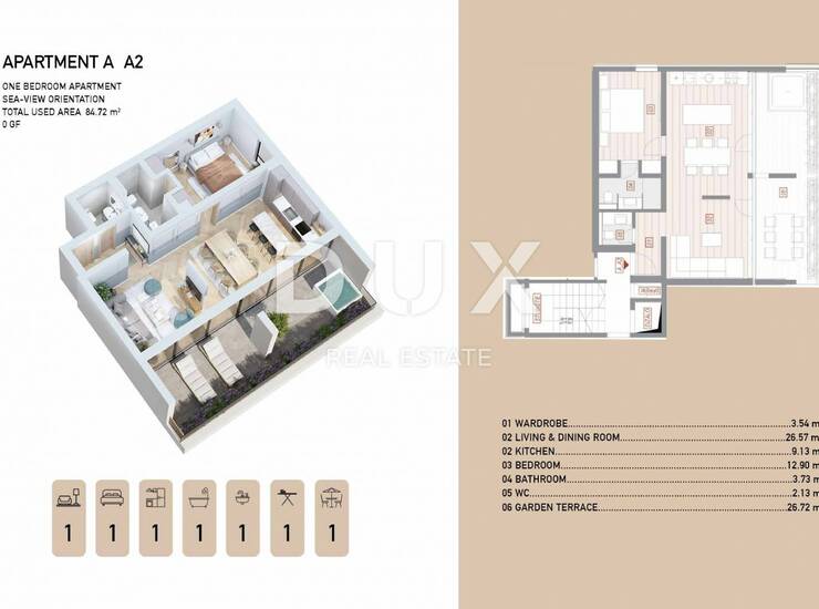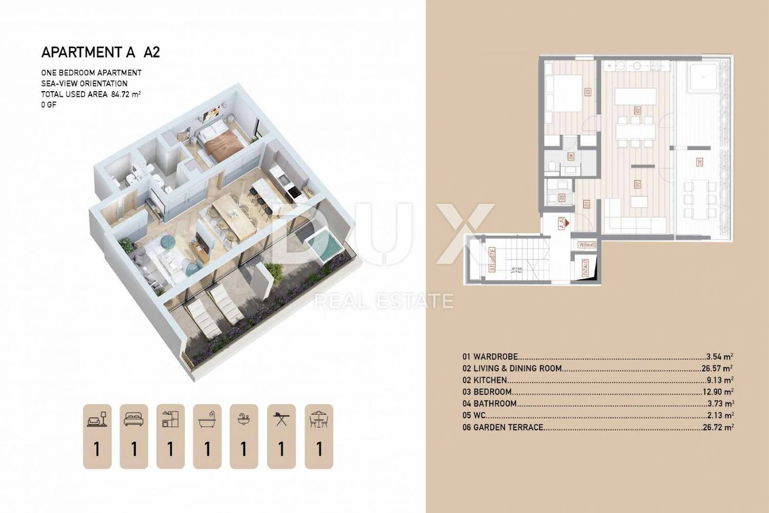 Ovaj ekskluzivni projekt sastoji se od dvije moderno dizajnirane zgrade, savršeno uklopljene u mediteranski pejzaž, a svaka zgrada sadržavat će šest stanova različitih kvadratura (od 48 m² do 240 m²). Posebnu vrijednost predstavljaju penthouse stanovi s panoramskim pogledom, kao i stanovi u prizemlju s privatnim terasama i vrtovima. Svaka jedinica pruža neometan pogled na Kvarnerski zaljev.