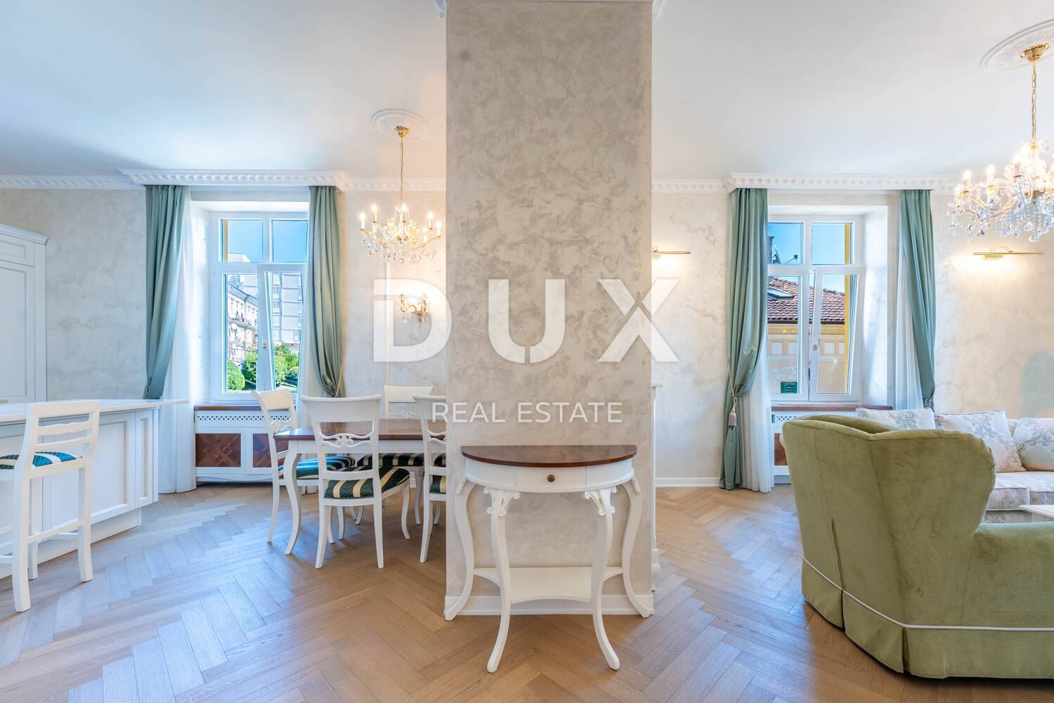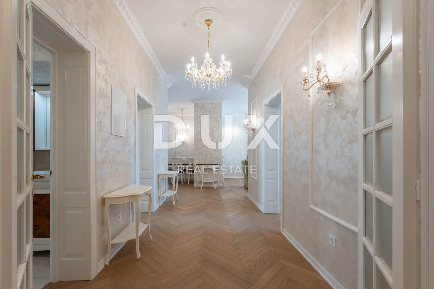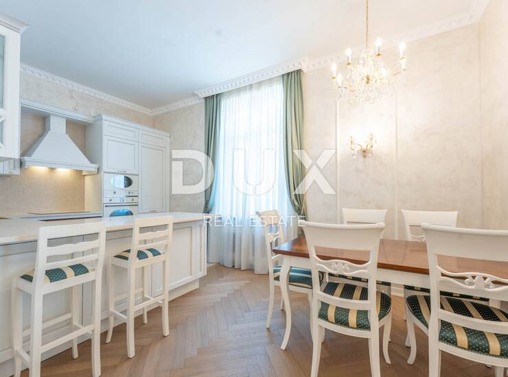 Namještaj je ručni rad, izrađen u renomiranoj stolarskoj radionici u Veroni, a kristalni lusteri dodatno naglašavaju luksuzan ugođaj prostora. Svaki detalj pažljivo je osmišljen i dizajniran kako bi ovaj stan postao savršena oaza elegancije i udobnosti.