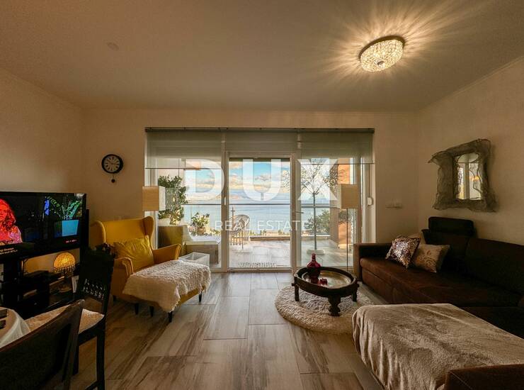 Sa svojih 78m², stan se nalazi na 1. katu zgrade, a uključuje hodnik, kupaonicu, WC, dvije spavaće sobe, veliki open space dnevni boravak sa staklenim stijenama koje pružaju prekrasan pogled na more. Dnevni boravak komunicira s natkrivenom terasom, a stan općenito uključuje i ostavu i jedno vanjsko parkirno mjesto.