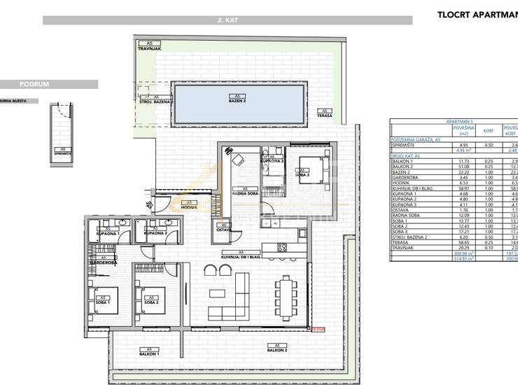 Luksuzni stan od 139.74 m2 obuhvaća kuhinju, blagovaonicu i dnevni boravak, tri spavaće sobe, ostavu, garderobu, radnu sobu, hodnika, tri kupaonice.