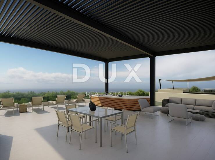 Na izuzetnoj krovnoj terasi je predviđena pergola površine oko 30 m2, prostor za ljetnu kuhinju sa svim potrebnim instalacijama te jacuzzi ili bazen, što ovu terasu pretvara u privatnu oazu savršenu za uživanje, druženje i opuštanje s otvorenim pogledom na more.