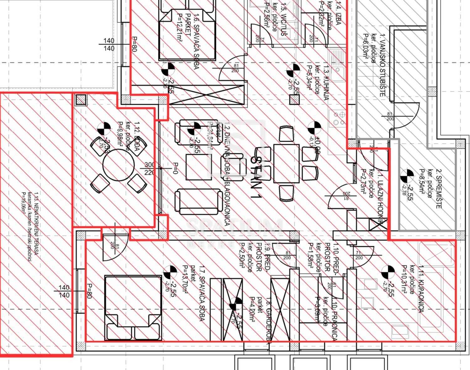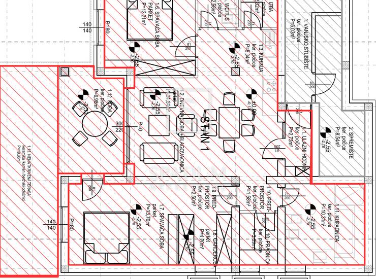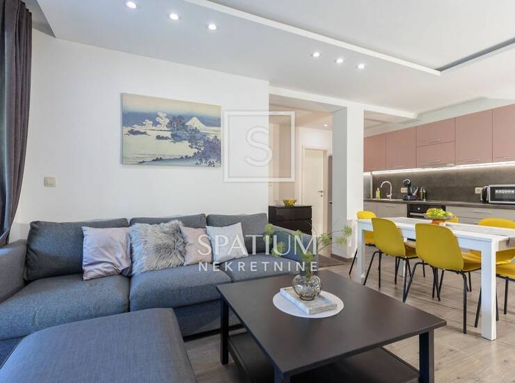 Smješten je u zgradi sagrađenoj 2020. godine, a sastoji od ulaznog hodnika, prostrane dnevne sobe povezane s blagovaonicom, velike potpuno opremljene kuhinje, dvije velike spavaće sobe, dvije kupaonice – jedna s kadom i jedna s tušem, natkrivene i nenatkrivene terase s izlazom u privatni vrt.