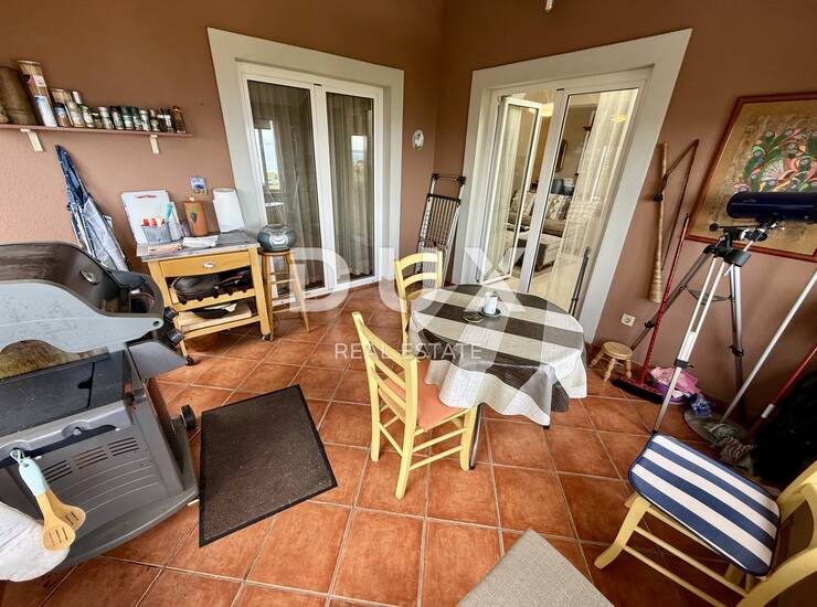 Sastoji se od dvije spavaće sobe, dva kupatila, hodnik, ostava, velike prostorije dnevnog boravka s kuhinjom i blagovaonicom, te predivne natkrivene terase. Raspored stana je odličan. Stan je uređen i useljiv. Grijanje na drva i klima uređajem. Terasa prostrana s pogledom na more. Pripada mu ostava!