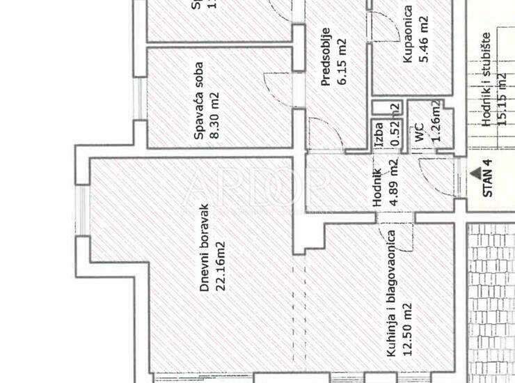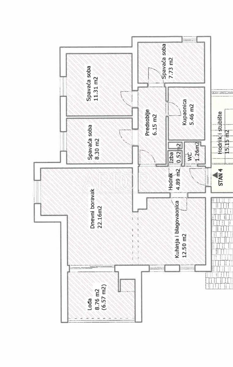 Stan obuhvaća ulazni hodnik, kuhinju povezanu s blagovaonicom, dnevni boravak, predsoblje, tri spavaće sobe, kupaonicu, dodatno spremište te dodatni toalet za goste. Kao dodatne pogodnosti izdvajaju se lođa na drugom katu te drvarnica u prizemlju, koje pripadaju stanu i povećavaju njegovu funkcionalnost. Stan je useljiv ali je potrebna renovacija.