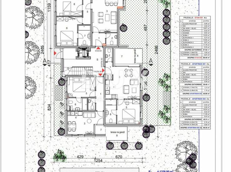 -PRIZEMLJE- ukupne površine 250m2 – 3 stana (dva stana 1S+DB i jedan stan 2S+DB)