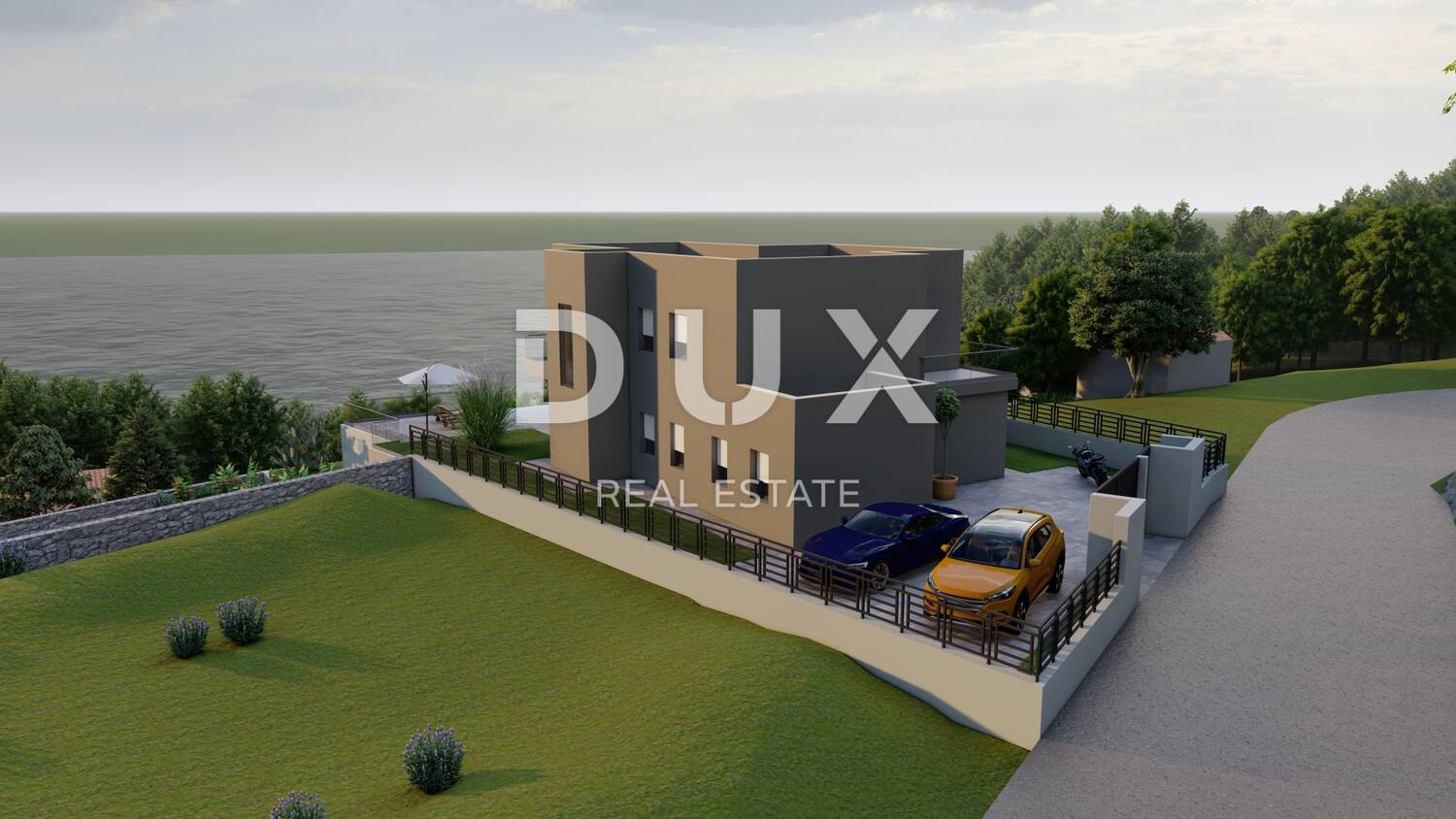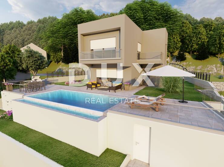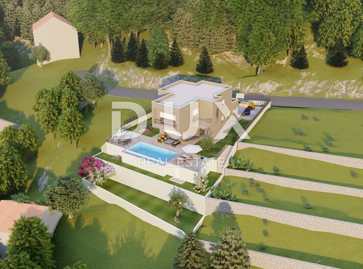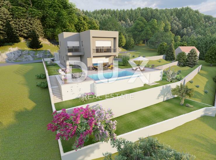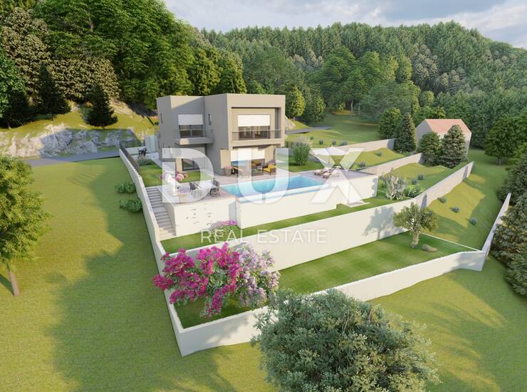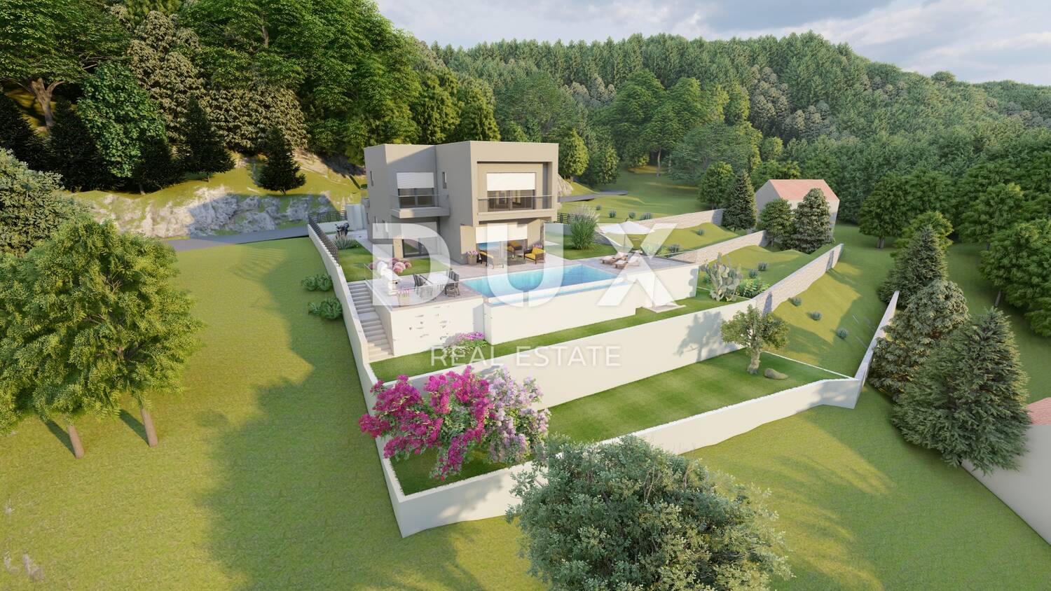 Parcela površine 690 m² prostire se na dvije pravilne, ravne kaskade i nudi predivan, otvoren pogled na Kvarnerski zaljev. Projekt je pomno usklađen s konfiguracijom terena, čime se smanjuje potreba za dodatnim zemljanim radovima i iskopima.