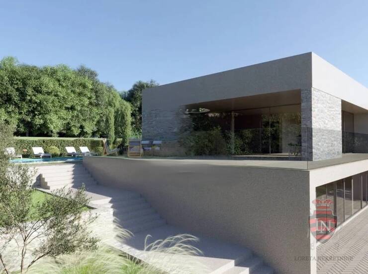 Kuća je dizajnirana za održivost i uključuje vlastiti sustav solarne energije (kapaciteta približno 10 kW) i električno podno grijanje, što osigurava energetski učinkovit i udoban boravak tijekom cijele godine. Smještena na padini, nudi očaravajući pogled na okolne brežuljke. Prizemlje, kojem se pristupa s razine parkinga, obuhvaća dnevni boravak, kuhinju, blagovaonicu i ostale dnevne prostorije. Na nižoj etaži nalaze se tri spavaće sobe, svaka s vlastitom kupaonicom. Kuća će biti izgrađena od visokokvalitetnih i modernih materijala, a stakleni atrij s prirodnim drvenim elementima pruža osjećaj mira i povezanosti s prirodom.