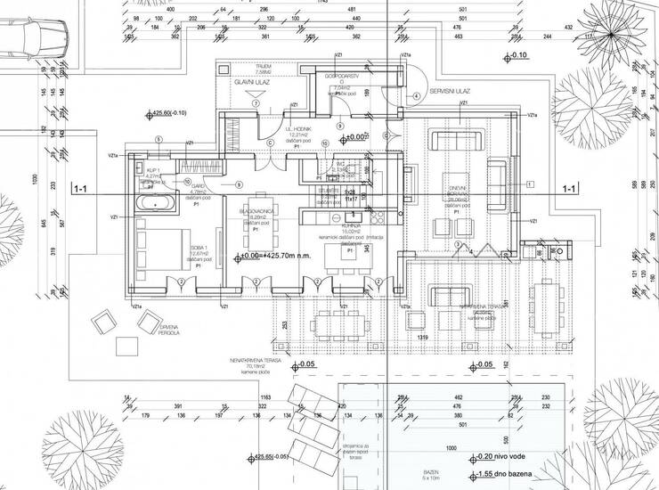 Kuća se sastoji od prizemlja i prvog kata. U prizemlju se nalazi: ulaz, vešeraj, spavaća soba s kupaonom, dnevni boravak, kuhinja, balgavaona, gostinjski toalet. U dvorištu se nalaze natkrivena terasa, bazen i sunčalište. Prvi kat uključuje hodnik, 2 spavaće sobe s vlatitim kupaonama i garderobama.