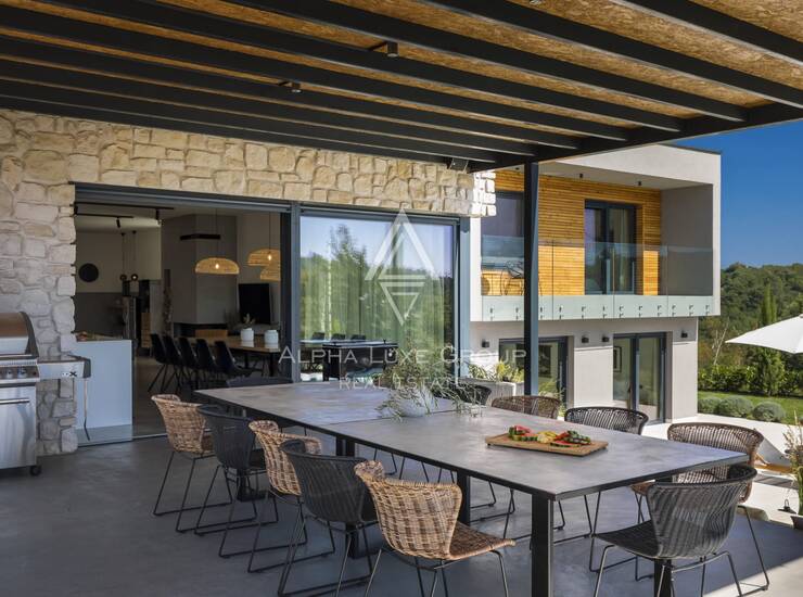 Smještena u mirnom krajoliku pazinskog područja, ova iznimna suvremena vila pruža profinjenu eleganciju, potpunu privatnost i vrhunsku udobnost. Pozicionirana na prekrasno uređenom imanju većem od 5.000 m², idealan je izbor za one koji traže luksuzni obiteljski dom ili sigurnu investiciju na istarskom tržištu nekretnina.