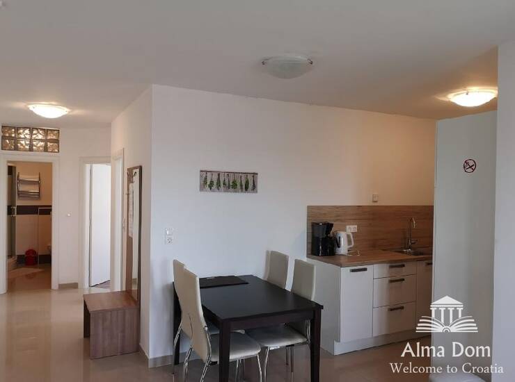 Stan se sastoji od dvije spavaće sobe, kupatila, kuhinje, blagovaonice, terase te mansarde u kojoj je namjena da bude još jedna spavaća soba.