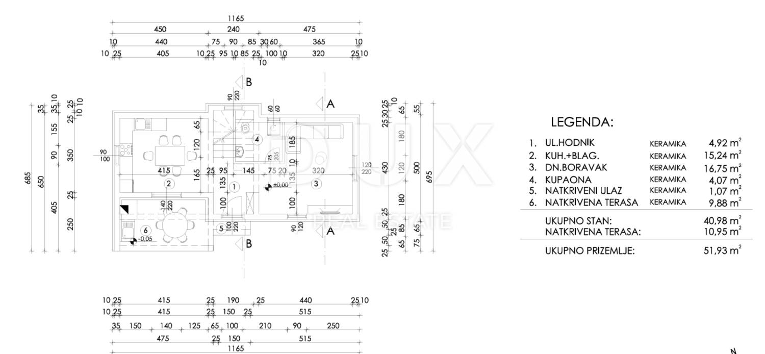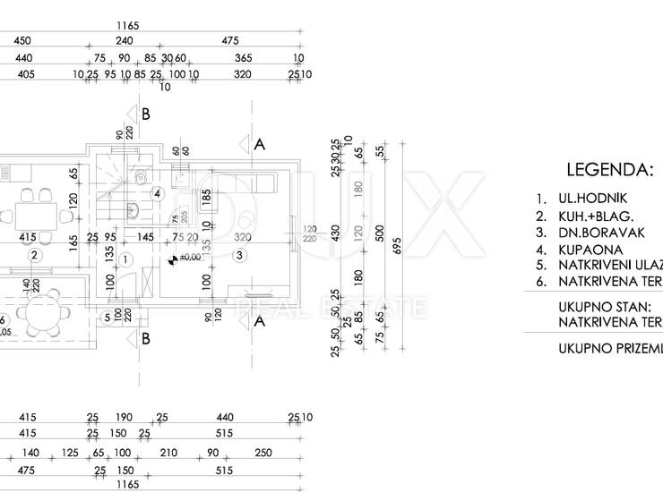 Prizemlje sa svojih 51.93 m2 nudi prostranu kuhinju, blagovaonicu i dnevni boravak, koji su savršeno povezani u jedan otvoreni "open space" prostor. Veliki prozori omogućuju obilje prirodne svjetlosti i pružaju izravan izlaz na natkrivenu terasu, idealnu za uživanje na na svježem zraku uz cvrkute ptica.