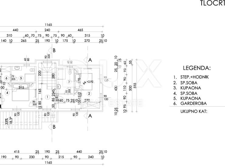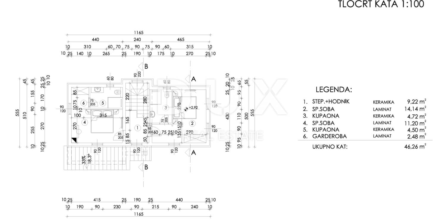 Unutarnje stepenice vode na gornju etažu površine 46.26 m2, gdje se nalaze dvije komforne spavaće sobe, svaka sa svojom kupaonicom.