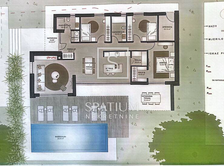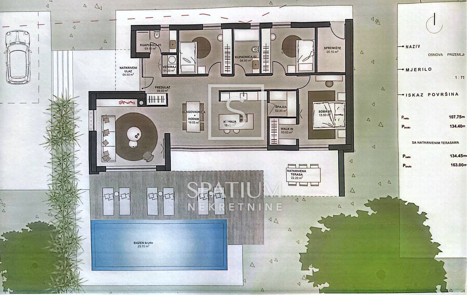 PIĆAN, u ponudi imamo građevinsko zemljište s projektom moderne prizemnice ukupne površine 134 m².