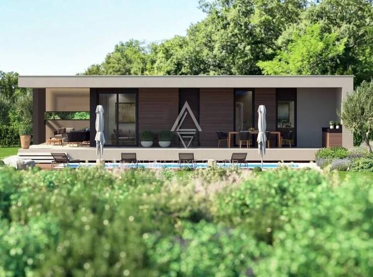 Predstavljamo iznimno modernu vilu, prekrasno smještenu na periferiji blizu Poreča, na granici zone gradnje unutar mirnog susjedstva. Ova izvanredna nekretnina smještena je na pozadini maslinika, utjelovljujući bit mediteranskog duha. Njena lokacija nudi savršenu ravnotežu između osame od užurbanog gradskog života i blizine osnovnih sadržaja, osiguravajući životni stil koji spaja mir i praktičnost. Protežući se na životnom prostoru od 98 m² na velikoj parceli od 575 m², dizajn vile obuhvaća otvoreni tlocrt, maksimizirajući prodiranje prirodnog svjetla kroz prostrane staklene zidove i pružajući lakoću pristupa u svim prostorijama, što je pogodno i za osobe smanjene pokretljivosti. Ulaz, zaštićen natkrivenim ulazom, otvara se u dobrodošli hodnik s garderobom, koji vodi do kombiniranog prostora kuhinje, blagovaonice i dnevnog boravka, sve dizajnirano za fluidno iskustvo življenja. Vila sadrži dvije spavaće sobe, kupaonicu i zaseban WC. Središnji dio vrta je veliki grijani bazen od 30 m² okružen sunčalištem, savršen za odmor i zabavu. Uz bazen se nalazi natkrivena terasa s vanjskom kuhinjom, idealna za blagovanje na otvorenom. Vrt pruža parkiralište za najmanje dva vozila, dodajući praktičnost. Smještena na posljednjoj dostupnoj parceli u zoni gradnje, ova vila obećava neprikosnovenu mir, privatnost i zadivljujuće poglede na prirodno okruženje. Ova moderna vila, kompletna s grijanim