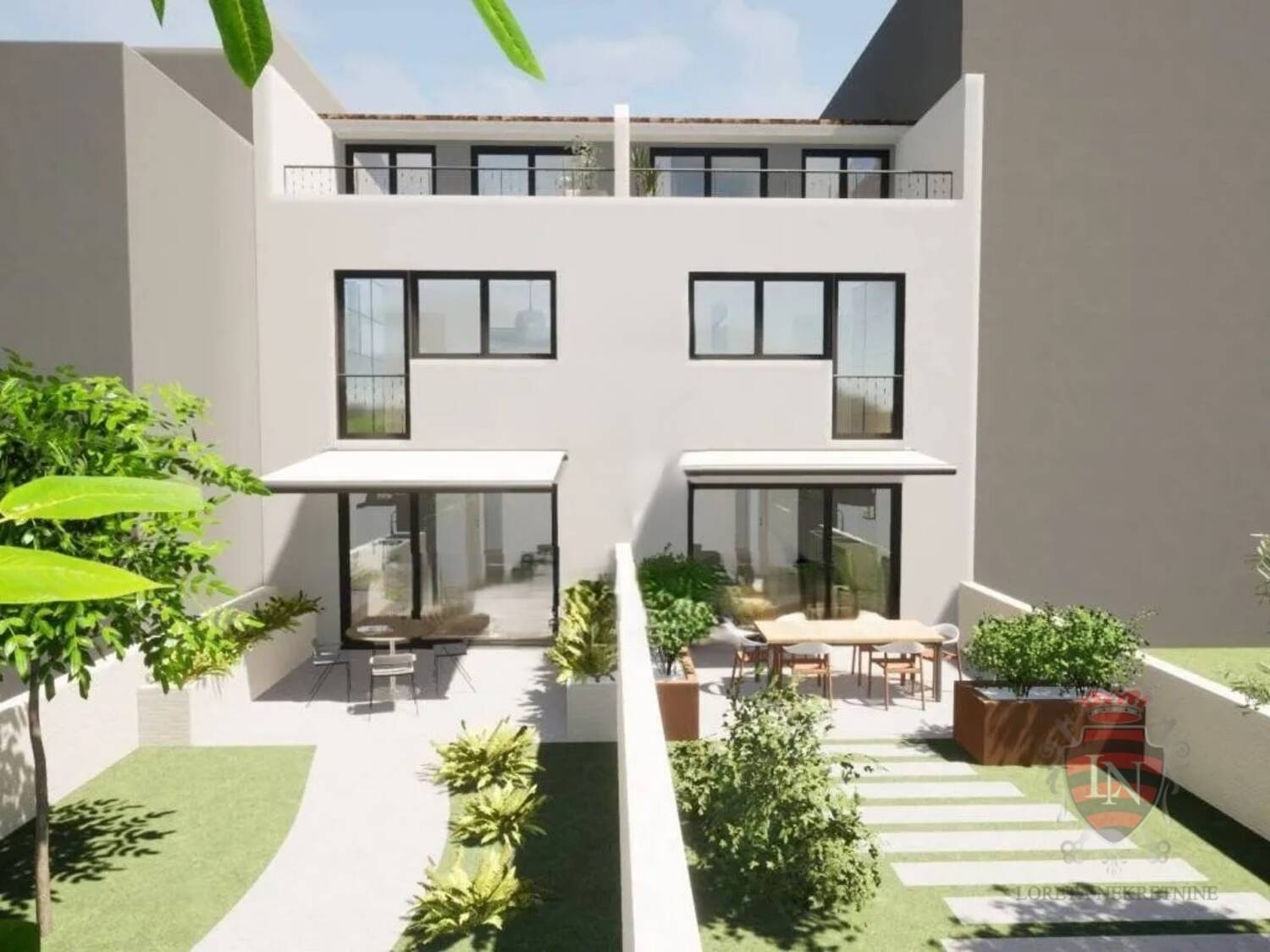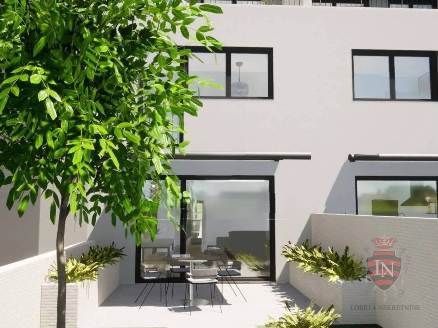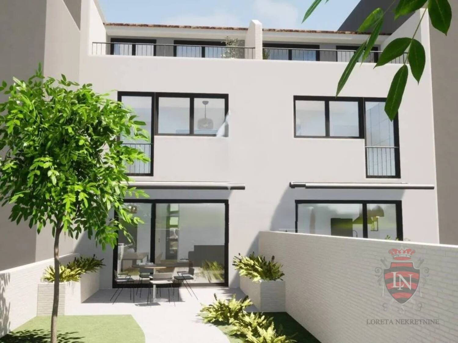 Svaka jedinica se prostire na tri etaže - prizemlje, prvi kat i potkrovlje. Prizemlje dočekuje s ulaznim hodnikom, kupaonicom, tečnim prijelazom iz kuhinje u blagovaonicu i dnevni boravak, uz dodatak dvije pomoćne prostorije. Veliki stakleni zidovi otvaraju se prema pažljivo uređenom vrtu s vanjskom kuhinjom za blagovanje na otvorenom.