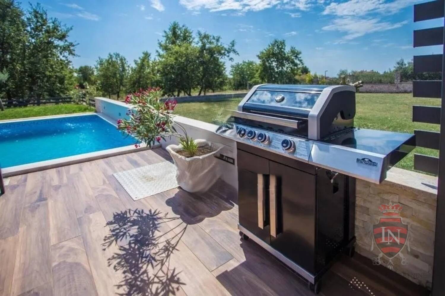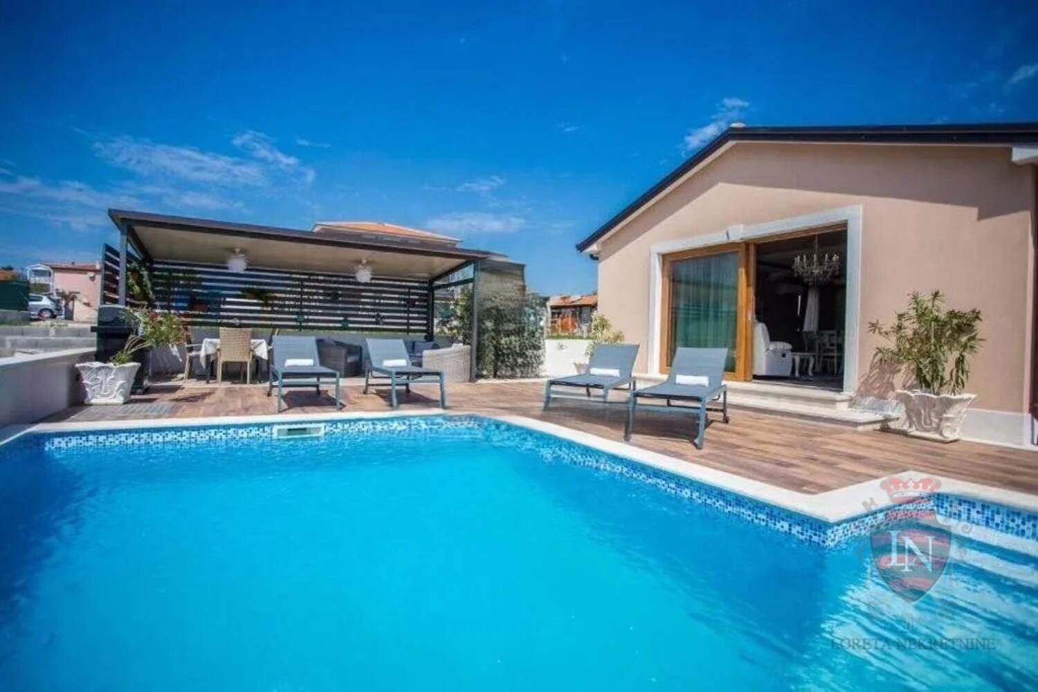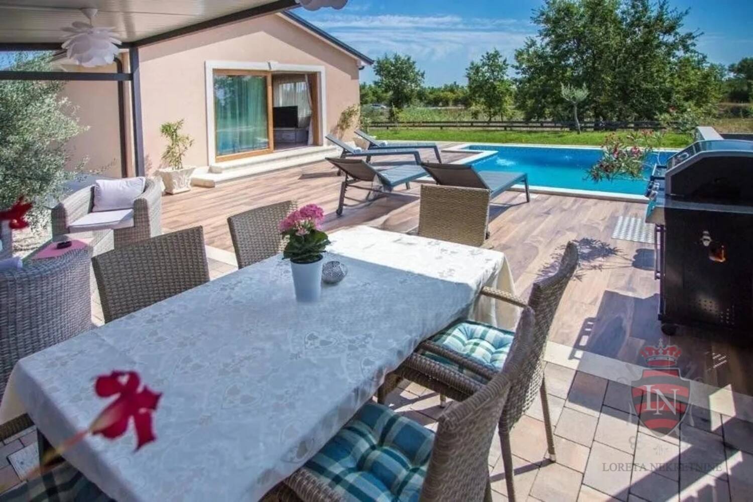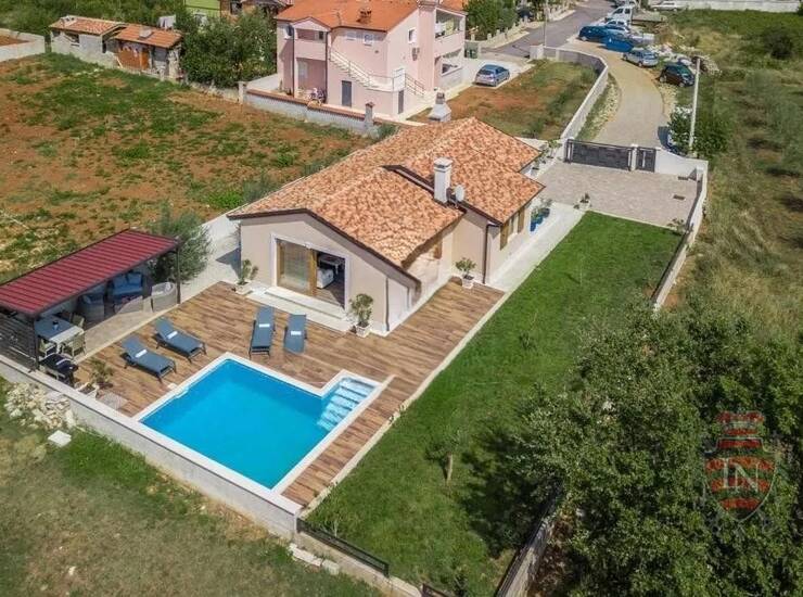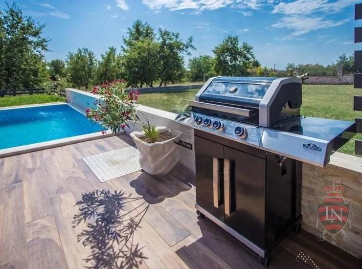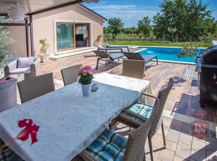 Iz dnevnog boravka se izlazi na terasu koja vodi u lijepo uređenu okućnicu gdje se nalazi bazen sa bazenom.