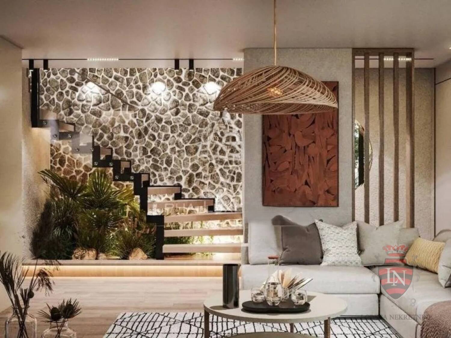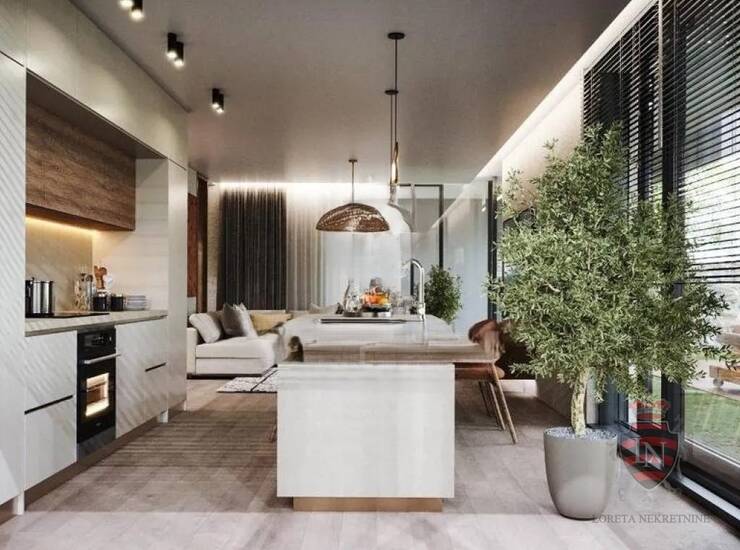 Kuća se prostire na dvije etaže. U prizemlju se nalazi prostrani otvoreni dnevni prostor koji povezuje dnevni boravak, blagovaonicu i kuhinju s izravnim izlazom na natkrivenu terasu. Terasa je opremljena ljetnom kuhinjom i saunom, stvarajući savršen spoj unutarnjeg i vanjskog prostora. Prizemlje uključuje i spavaću sobu, gostinjski toalet te tehničku sobu.