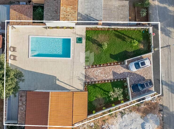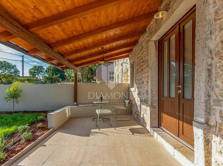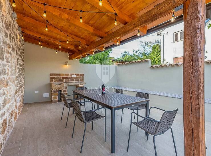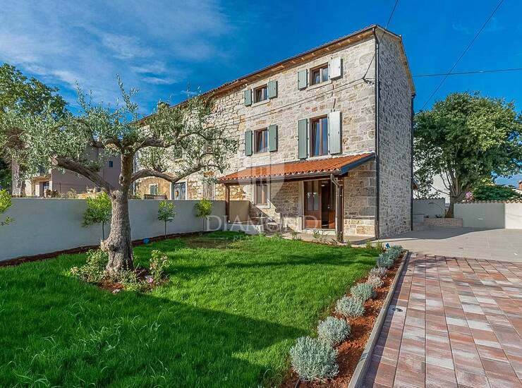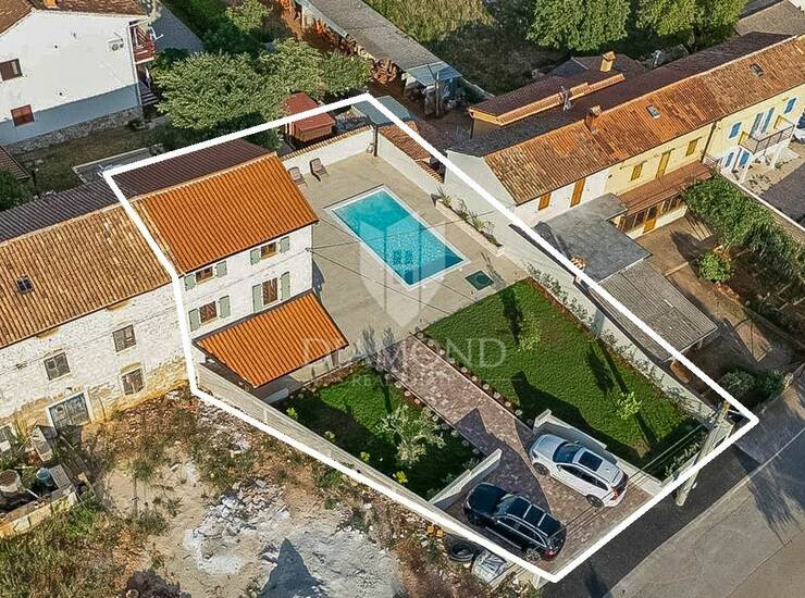 Okućnica od preko 450m2 je u potpunosti ograđena i uređena s mnogo pažnje — bazen, sunčalište, natkrivena vanjska kuhinja s grillom i tušem stvaraju savršeno mjesto za opuštanje. Topli zemljani tonovi, istarski kamen i suvremeni detalji čine ovu kuću jedinstvenim domom spremnim za useljenje.