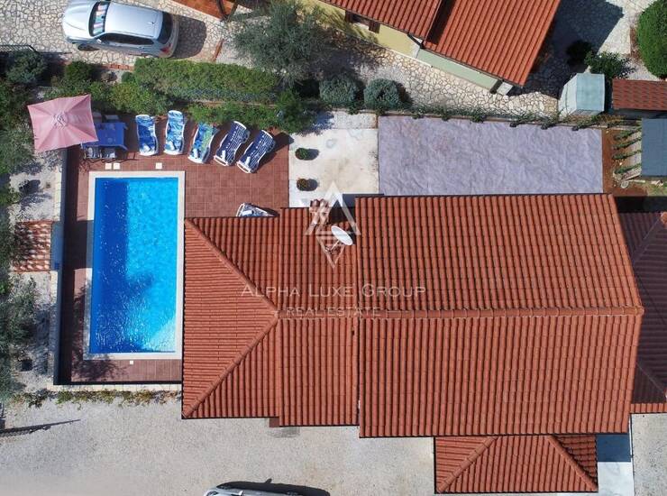 Kuća se proteže na dvije etaže, prizemlje i kat. Unutrašnjost obuhvaća prostran i svijetao dnevni boravak povezan s kuhinjom i blagovaonicom, stvarajući ugodno okruženje za svakodnevni život i druženja. Na raspolaganju su tri pravilno raspoređene spavaće sobe i dvije kupaonice, koje osiguravaju funkcionalnost i komfor za obitelj ili goste. Iz dnevnog boravka omogućen je izravan izlaz na natkrivenu terasu, idealnu za objedovanje na otvorenom i uživanje u vrtu tijekom cijele godine.