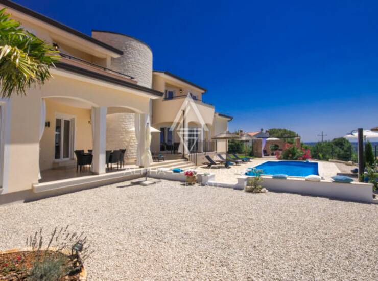 Vanjski prostor jednako je impresivan — uređeni mediteranski vrt, bazen s prostorom za sunčanje, natkrivene lounge zone za opuštanje i druženje, te očaravajući panoramski pogled na more koji upotpunjuje luksuzan i opuštajući ugođaj.