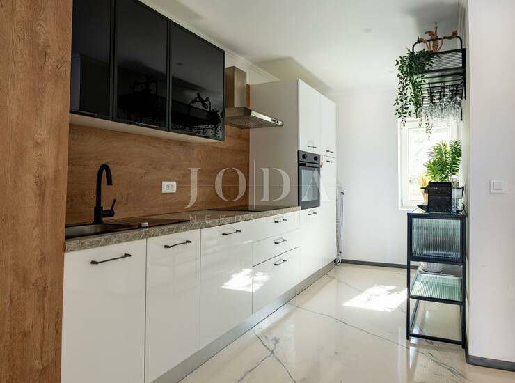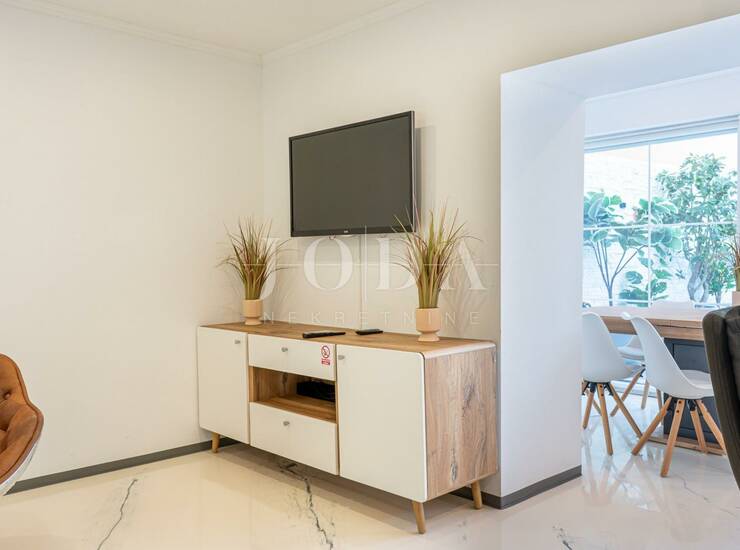 Stambena površina od 140 m2 sastoji se od prizemlja i dvije etaže, a uz nju se nalazi otvoreni bazen(sistem elektrolize) sa sunčalištem koji se može koristiti tokom cijele godine.