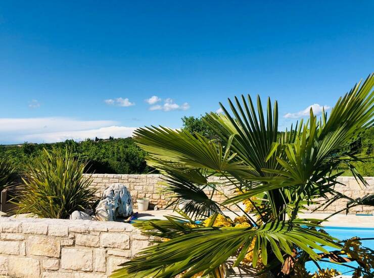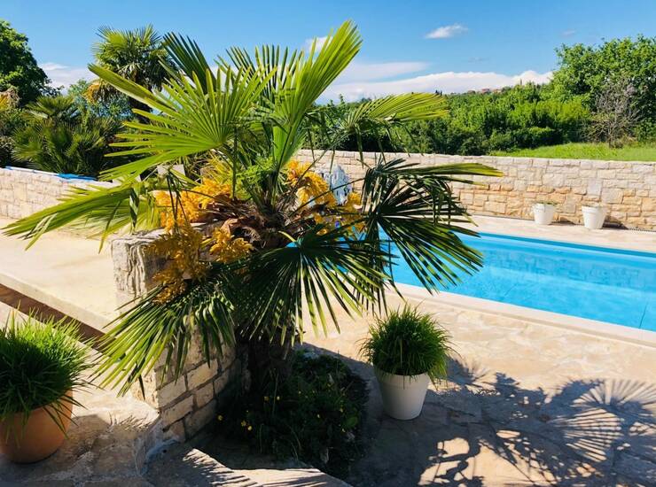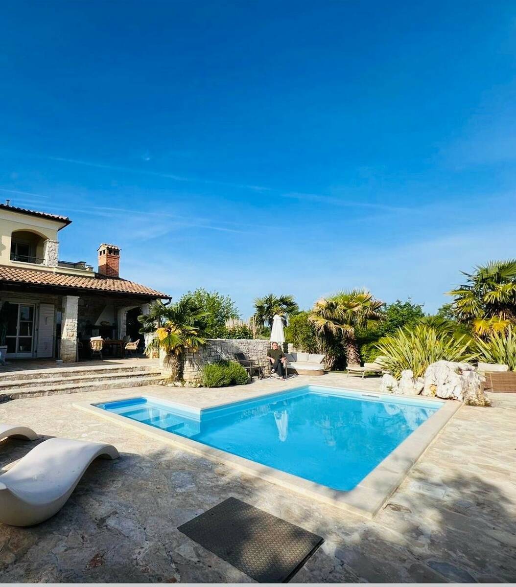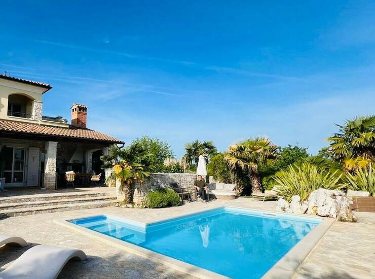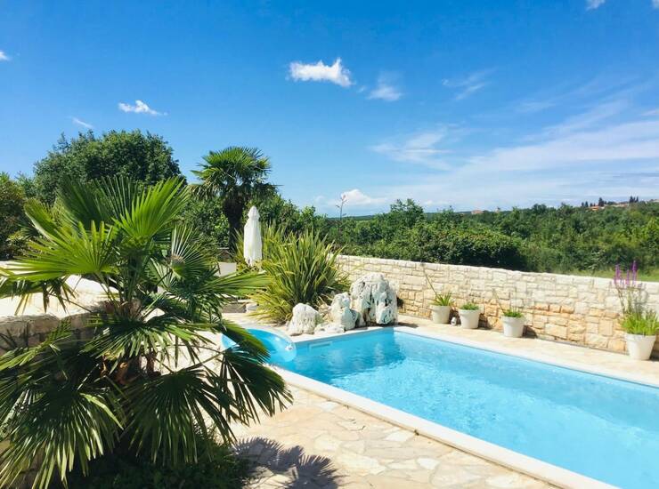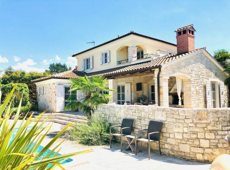 Okolica Poreča-Samostojeća vila u mediteranskom stilu od 115 m2 neto površine na parceli od 690 m2 sa pogledom na more- vila se prostire na dvije etaže- prizemlje: dnevni boravak sa kaminom, kuhinja i blagovaonica, 1 spavaća soba i 1 kupatilo i velika natkrivena terasa- kat: 2 spavaće sobe, kupatilo i balkon- bazen 3 x 7 m sa protustrujnim plivanjem- podno grijanje u cijeloj kući (ulje)- vanjski tuš sa toplom vodom- Vanjski prostor obuhvaća pažljivo održavan mediteranski vrt koji stvara mirnu i privatnu oazu. Natkrivena terasa i vanjski kameni roštilj idealni su za druženja i boravak na otvorenom, dok lounge zona uz prirodni kameni zid pruža savršeno mjesto za opuštanje. Balkon na prvom katu nudi lijep pogled i prostor za jutarnju kavu. Kuća se odlično iznajmljuje. U ponuđenoj cijeni kuća se prodaje bez namještaja, dok je u cijenu uključena ugradbena kuhinja.Mogućnost kupnje dodatne građevinske parcele uz kuću od 872 m2. Godina gradnje 2008.