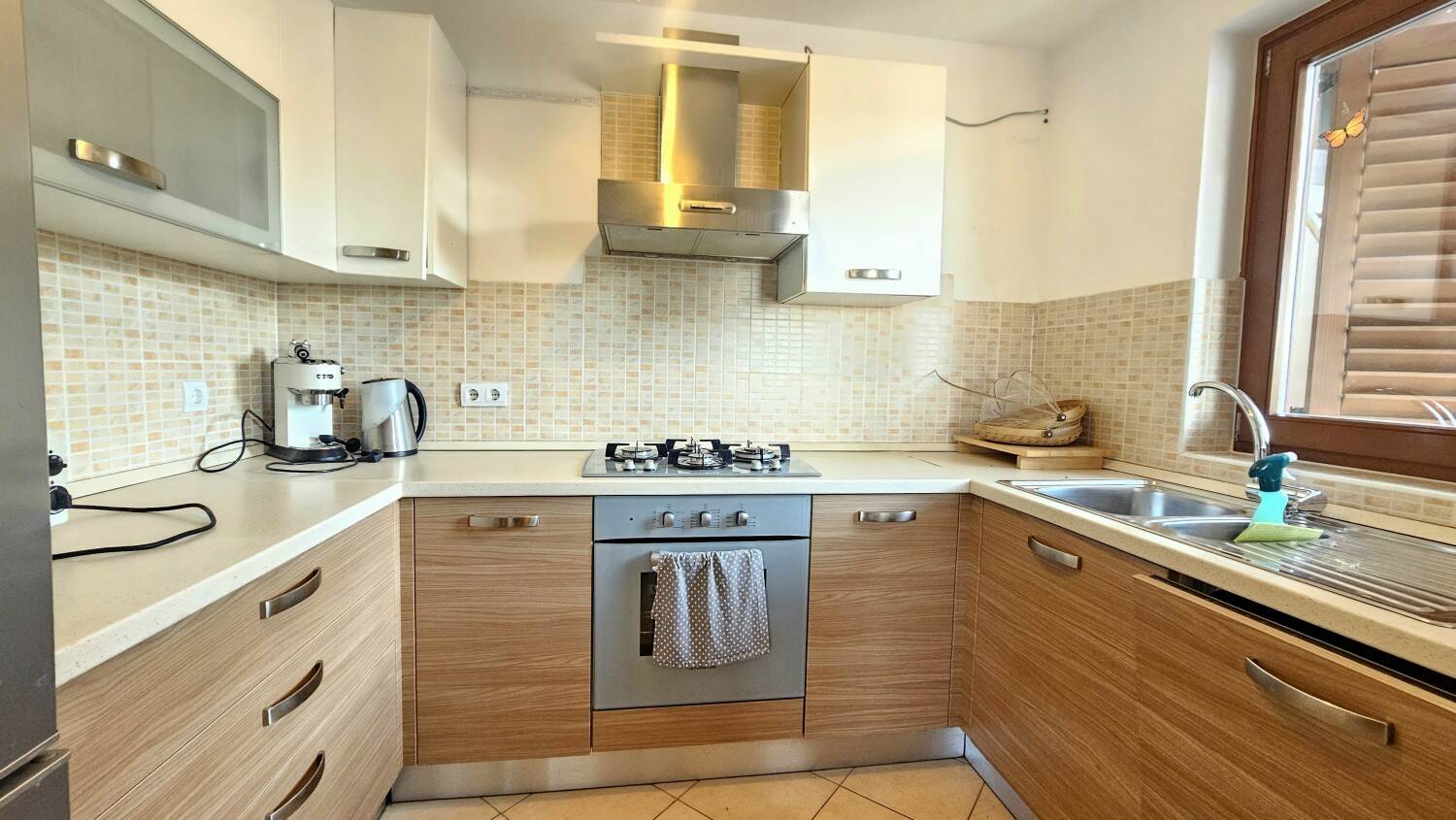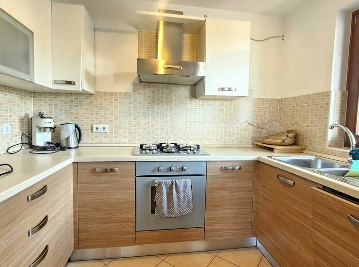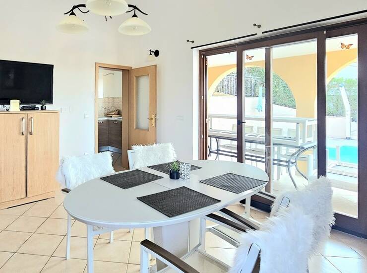Kuća ukupne površine 122 m² smještena je na parceli od 750 m² te nudi funkcionalan raspored na dvije etaže. U prizemlju se nalazi ulazni hodnik, spremište, spavaća soba, kupaonica te kuhinja povezana s blagovaonicom i dnevnim boravkom koji se otvara prema natkrivenoj terasi, sunčalištu i uređenom dvorištu s bazenom.