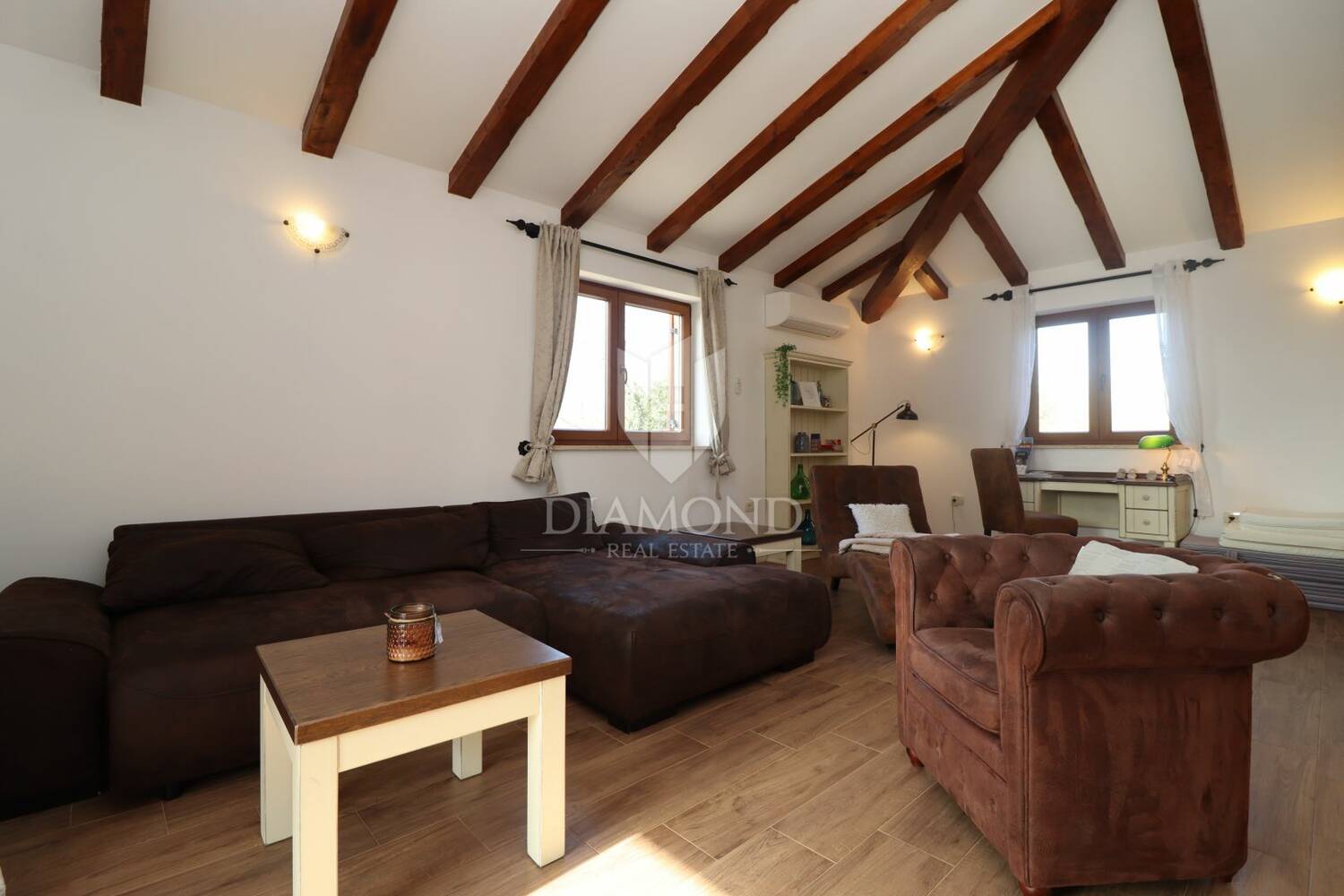 Kuća je klimatizirana u svim prostorijama, dok kamin u dnevnom boravku pruža dodatni ugođaj tijekom hladnijih mjeseci. Instalacije za centralno grijanje već su provedene, a potrebno je samo ugraditi radijatore i peć kako bi sustav bio u potpunosti funkcionalan.