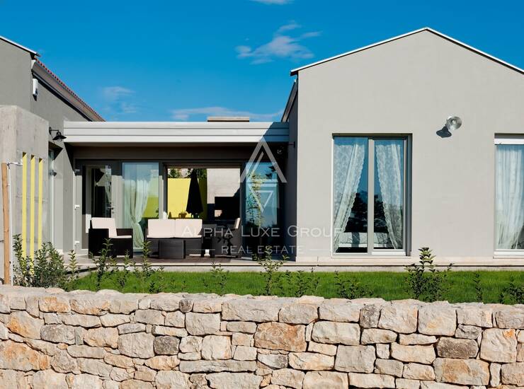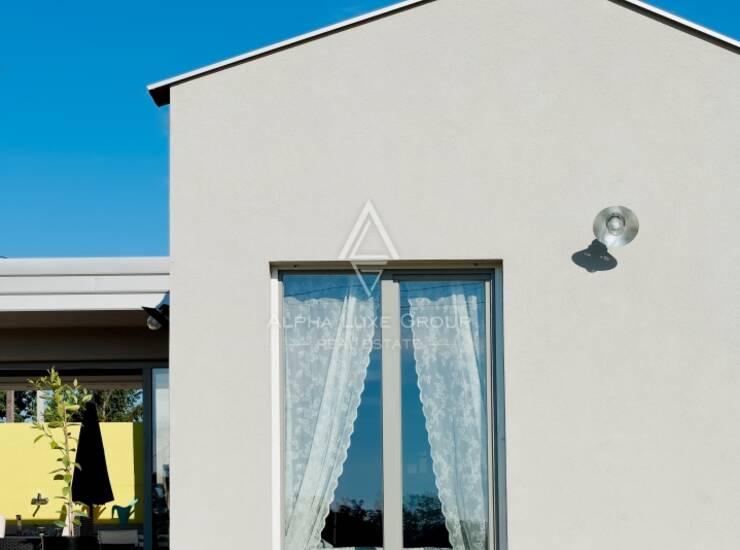 U vanjskom dijelu okućnice ističe se prekrasan bazen s idealnim sunčalištem, zaštićen visokim zelenilom koje pruža privatnost i mir. Tu je i šarmantni atrij s kaminom i velikim stolom – savršen za ugodna druženja, obiteljske večeri ili prijateljska okupljanja. Kuća je opremljena inverter klima uređajima koji omogućuju učinkovito grijanje i hlađenje tijekom cijele godine, a njezina montažna konstrukcija garantira brzo i jednostavno održavanje.