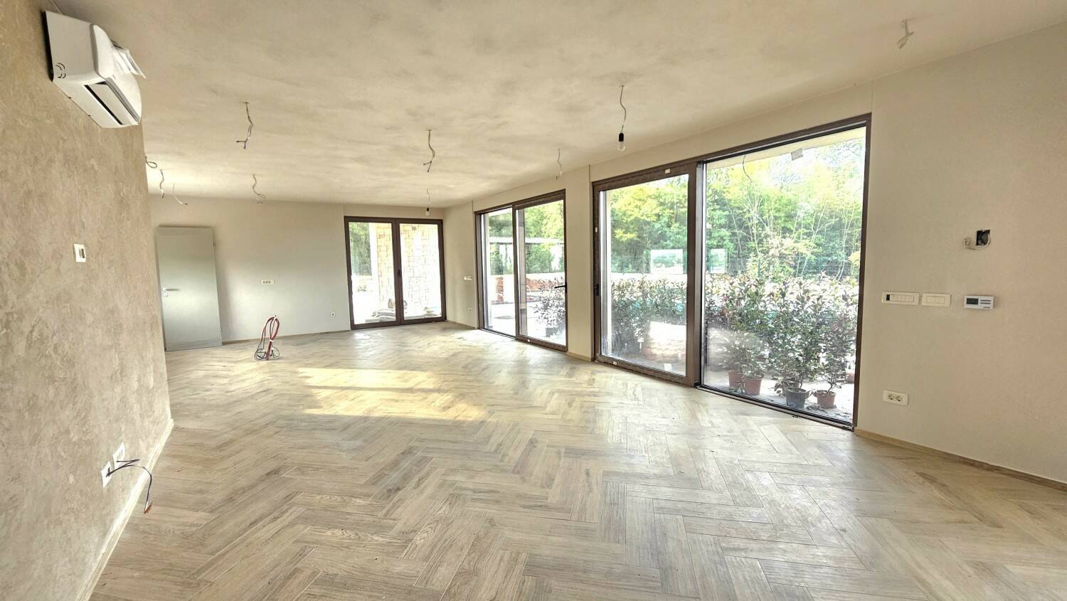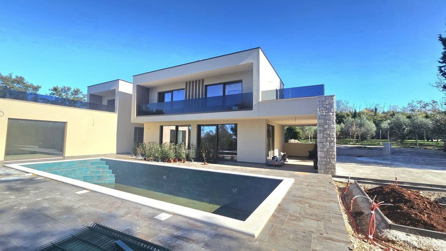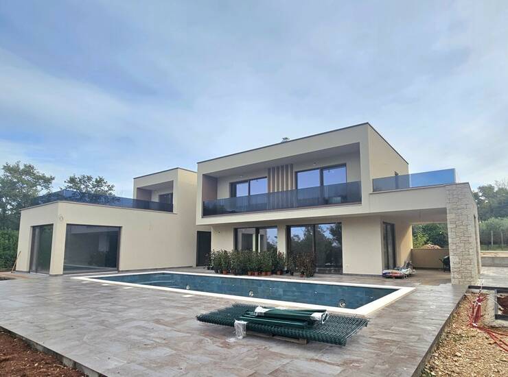 Prekrasna moderna vila cca 12 km od Poreča i 9 km od mora, na mirnoj lokaciji- Prizemlje: hodnik, dnevni boravak s blagovaonicom i kuhinjom, spavaća soba s kupaonicom, wellness soba sa teretanom i saunom, tehnička soba i wc- kat: tri spavaće sobe i 3 kupaonice- u prizemlju se nalazi prostrana natkrivena terasa i grijani bazen od 48 m2 (pločice)- Grijanje: električno podno grijanje i klima uređaji.