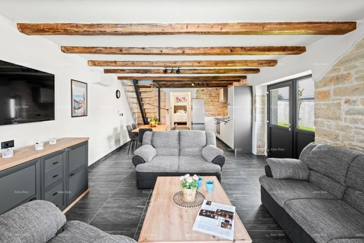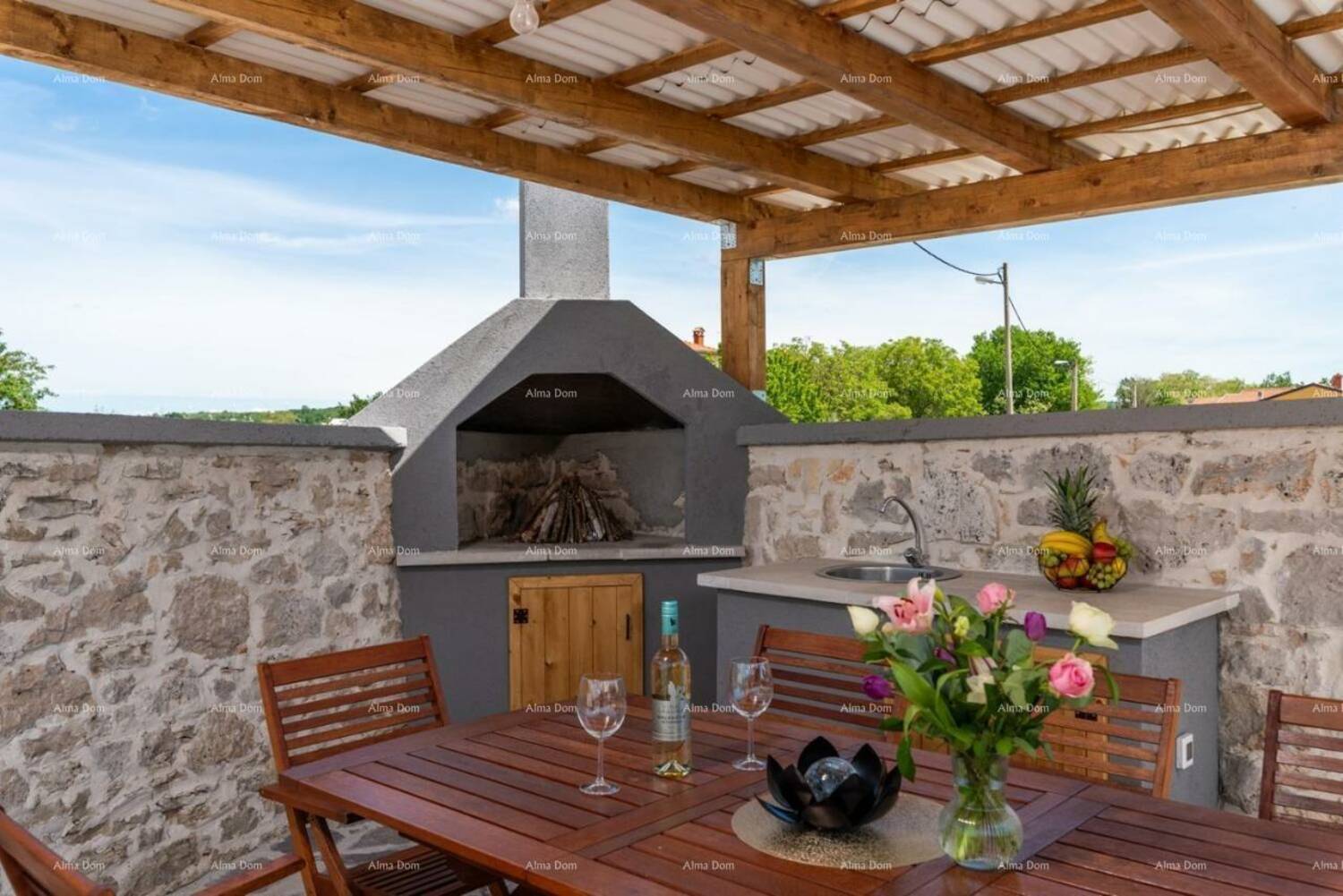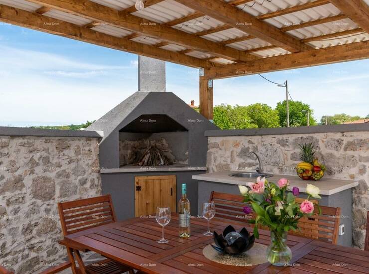 Kuća uključuje dnevni boravak sa kuhinjom i blagavaonom, 3 spavaće sobe, 3 kupaone, vešeraj, terasu koja ima vanjsku jedinicu za ručavanje (ljetnna kuhinja i roštilj) i vrt na kojem se nalazi bazen.