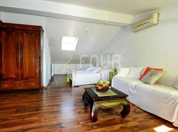Prostire se na prizemlje i dva kata te uključuje devet apartmanskih jedinica s odgovarajućim kupaonicama, balkone i spremište. Prizemlje sadrži poslovni prostor i hodnik koji vodi do pomoćnih prostorija, dok su na prvom i drugom katu smješteni apartmani različitih veličina, što omogućava fleksibilnu organizaciju smještaja. Zidana konstrukcija s drvenim međukatnim elementima, adaptiran krov i fasada, te PVC i drvena stolarija uz klimatizaciju dodatno naglašavaju kvalitetu objekta.