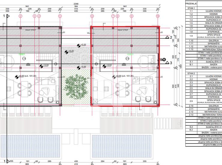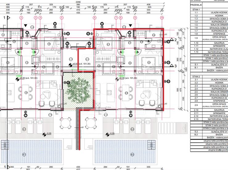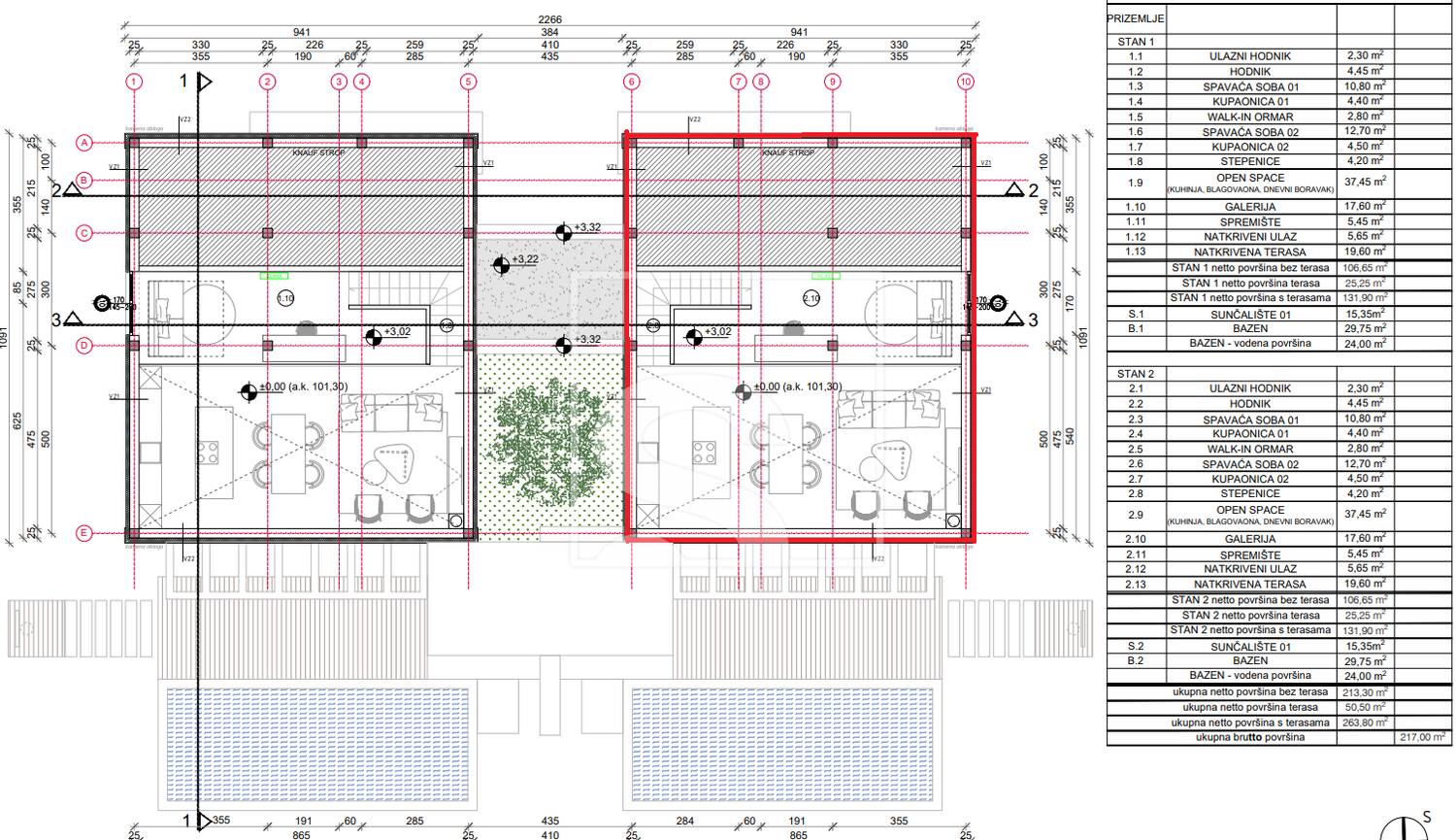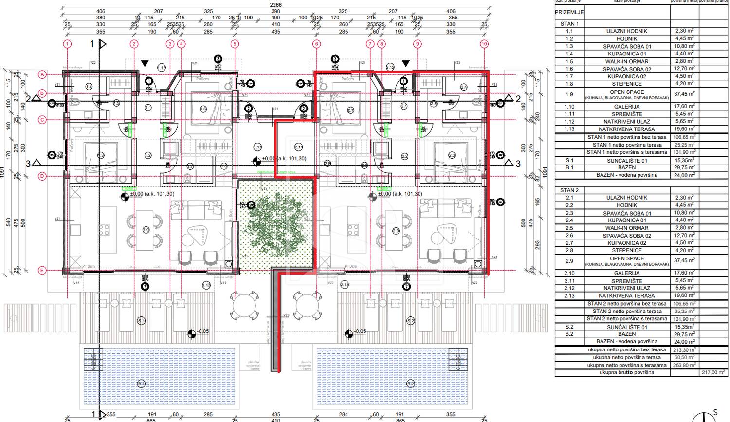 Kuća ima neto površinu od 115 m2 te je koncipirana kao duplex kuća spojena isključivo spremištem, čime se postiže dojam samostojeće kuće. Svaka jedinica raspolaže vlastitim vrtom površine približno 200 m2, privatnim bazenom i odvojenim vanjskim sadržajima.