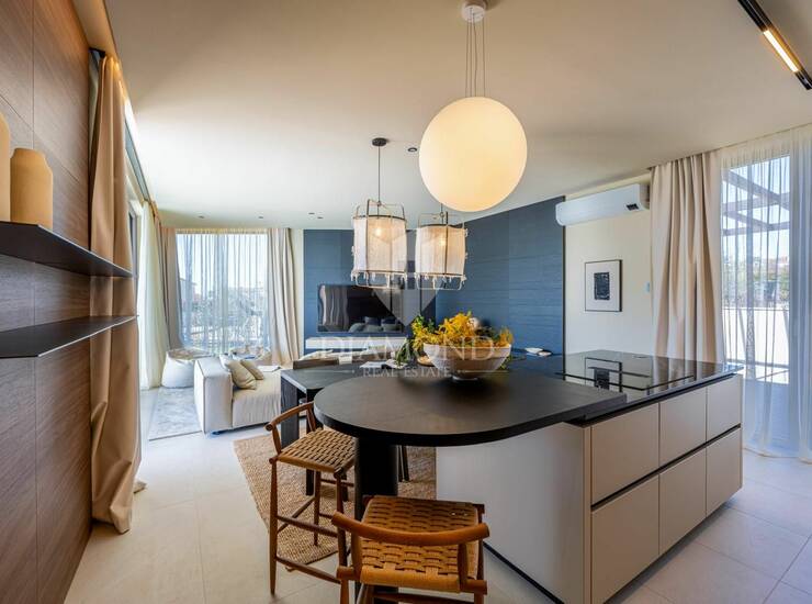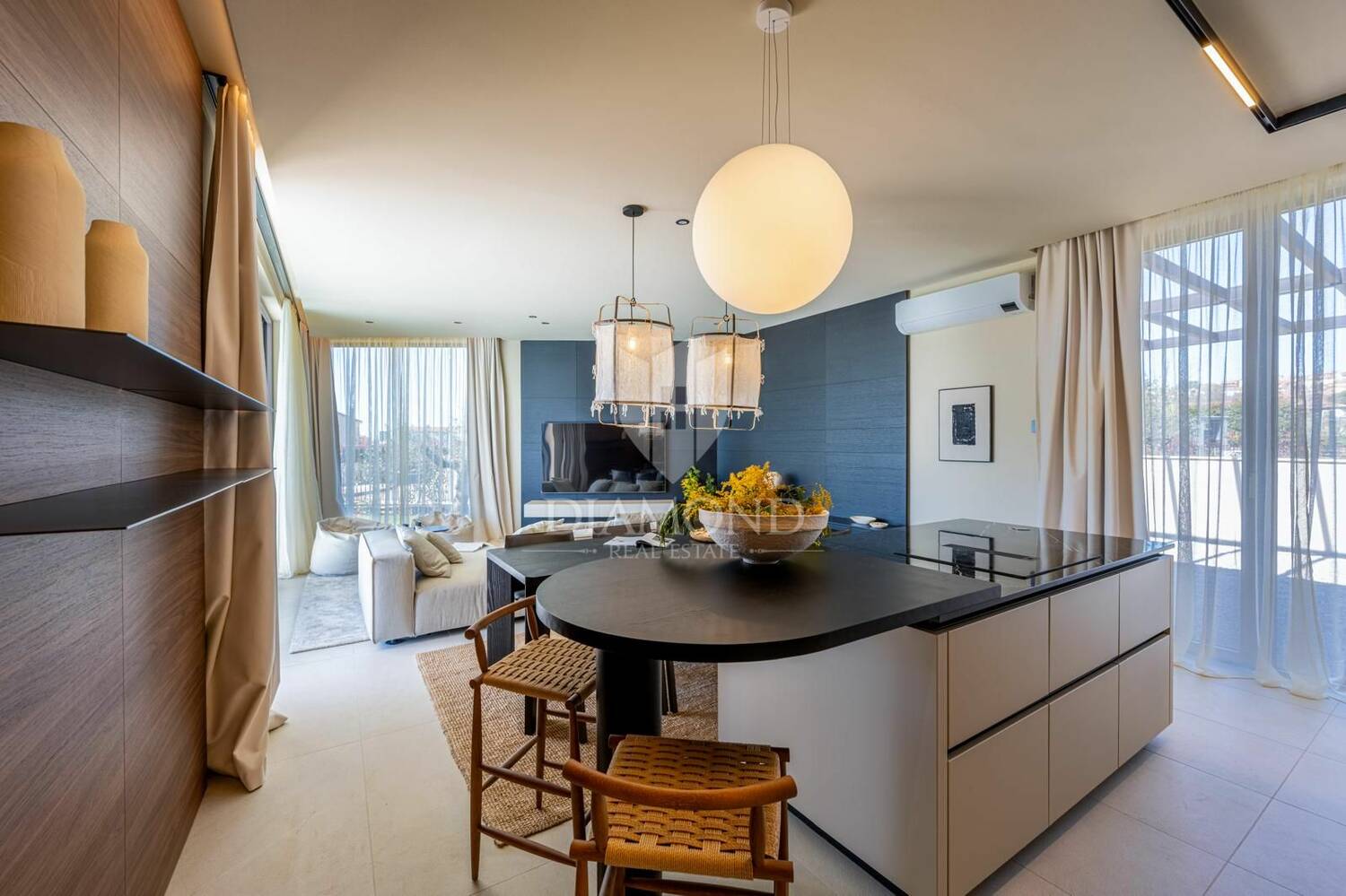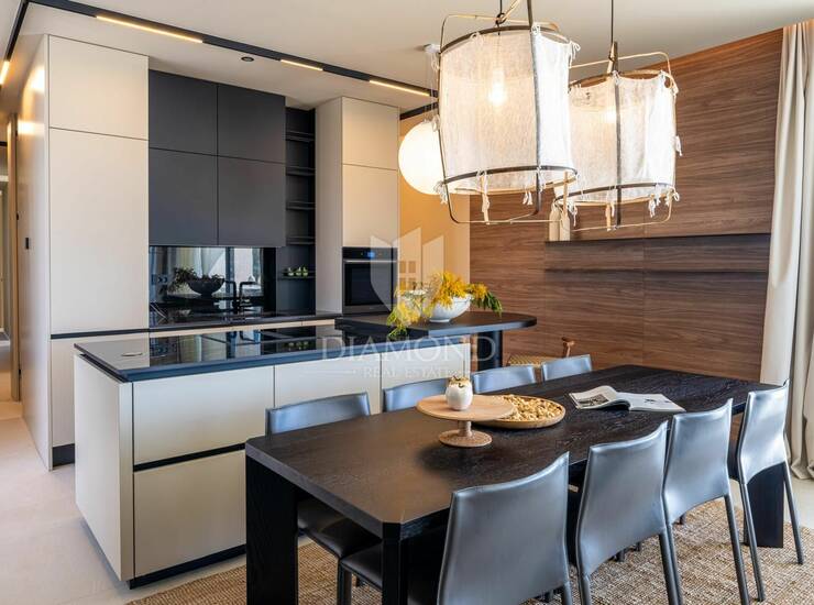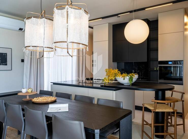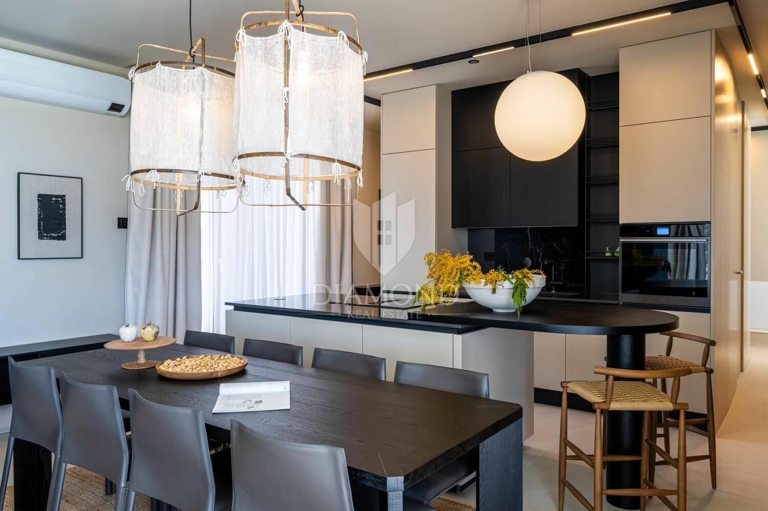 Interijer je u potpunosti opremljen dizajnerskim namještajem renomiranih brendova, dok troslojna stakla, aluminijska stolarija, spušteni stropovi i podne obloge od kvalitetne keramike naglašavaju razinu izvedbe.