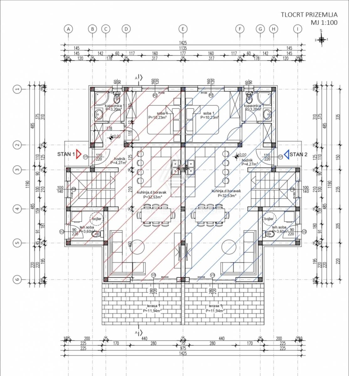 Kuća ukupne neto površine 310 m² nalazi se na zemljištu površine 690 m², te se prostire na tri etaže (prizemlje, kat i potkrovlje), a sastoji se od dvije potpuno odvojene stambene jedinice, svaka površine 155 m².