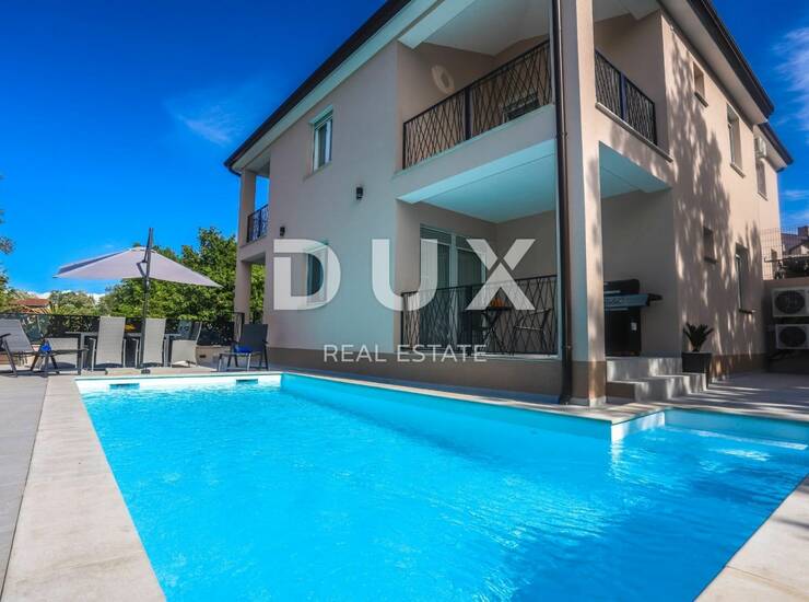Vila se prostire na dvije etaže, s ukupno dva parkirna mjesta ispred kuće. Veliki vrt površine 150 m², s roštiljem i bazenom, idealan je za obiteljska okupljanja i uživanje na otvorenom. Unutrašnjost kuće je klimatizirana i opremljena modernim sustavom grijanja, ventilacije i klimatizacije, osiguravajući optimalne uvjete tokom cijele godine.