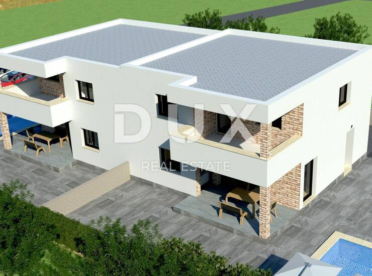 Nudimo Vam dvojnu kuću u izgradnji učiji se završetak predviđa do kraja slijedeće godine koja se nalazi u malenom i mirnom mjestu, prvom do grada Poreča, na uzvišenom dijelu koji pruža predivan pogled na prirodu i zelenilo.
