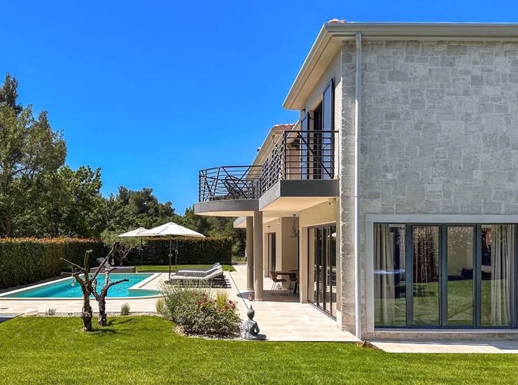 Veliki vrt oplemenjen je prekrasnim bazenom od 45m2 s slanom vodom i pripremom za grijanje, pružajući vam mogućnost osvježenja u luksuznom okruženju.
