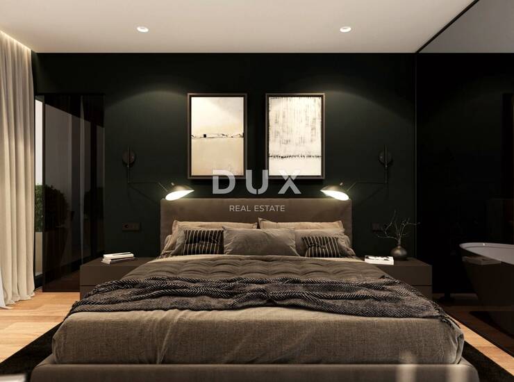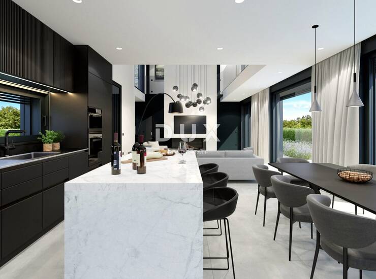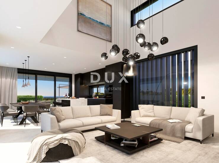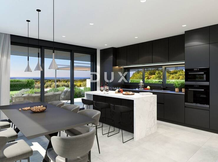 Ova očaravajuća vila u izgradnji površine 198,16 m² nudi luksuzan život samo 5 km od Poreča i 4 do 5 kilometara od najbliže plaže. Prizemlje sadrži otvoreni, svijetli prostor koji besprijekorno povezuje dnevni boravak, kuhinju i blagovaonicu, istaknut velikim staklenim stijenama i modernim detaljima. Spavaća soba s vlastitom kupaonicom i walk-in ormarom, tehnička soba, gostinjski WC i praonica rublja upotpunjuju prizemlje. Vani se nalazi grijani bazen sa slanom vodom koji služi kao središnji dio prekrasno uređenog vrta. Na prvom katu nalaze se tri spavaće sobe, svaka s vlastitom kupaonicom i walk-in ormarom, uz pristup privatnim terasama s panoramskim pogledom.