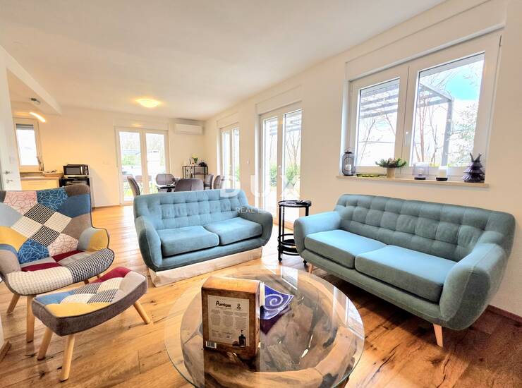 Kuća se prostire na 125,80 m2 stambene površine, raspoređene kroz tri funkcionalne etaže, čineći skladnu cjelinu idealnu za obiteljski život ili kombinaciju privatnog stanovanja i dodatnog apartmana.