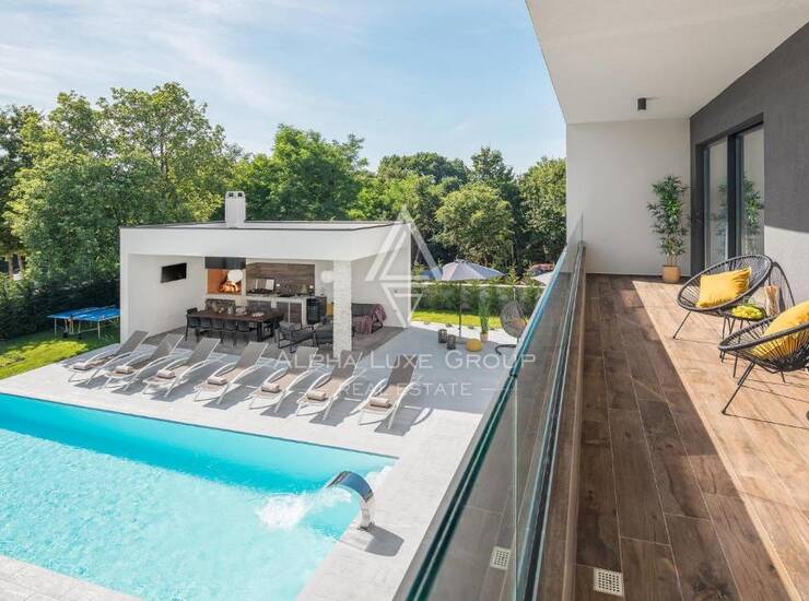 Potpuno ograđeno i hortikulturno uređeno dvorište zaokružuje atmosferu potpunog opuštanja. Bazen od 38 m² s prostorom za sunčanje i natkrivena ljetna kuhinja stvaraju savršeno okruženje za objedovanje na otvorenom, druženje i uživanje.