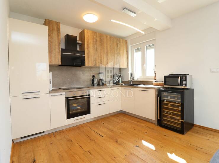 Potkrovlje je uređeno kao dodatni stambeni prostor s elementima apartmana – kuhinja, dnevni dio, soba i kupaonica. Povezano je unutarnjim stubištem pa može funkcionirati kao dio kuće ili kao odvojena cjelina, ovisno o potrebi.