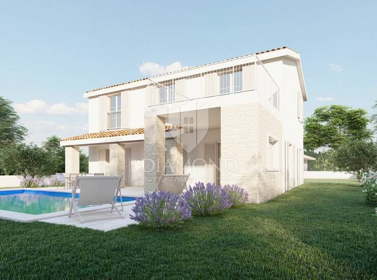 U manjem mjestu između Limskog kanala i Vrsara prodaje započeta gradnja moderne kuće koju krase autohtoni detalji. Ukupna neto površina kuće je 144 m2, s bazenom od 32 m2 i prostranim dvorištem.