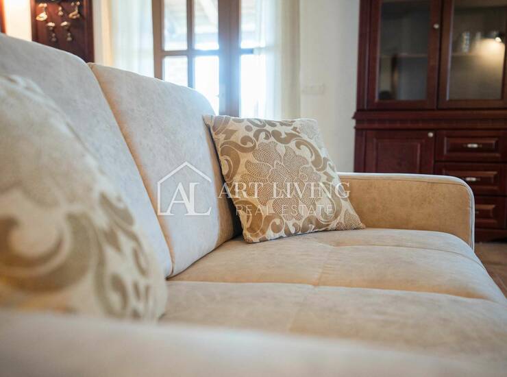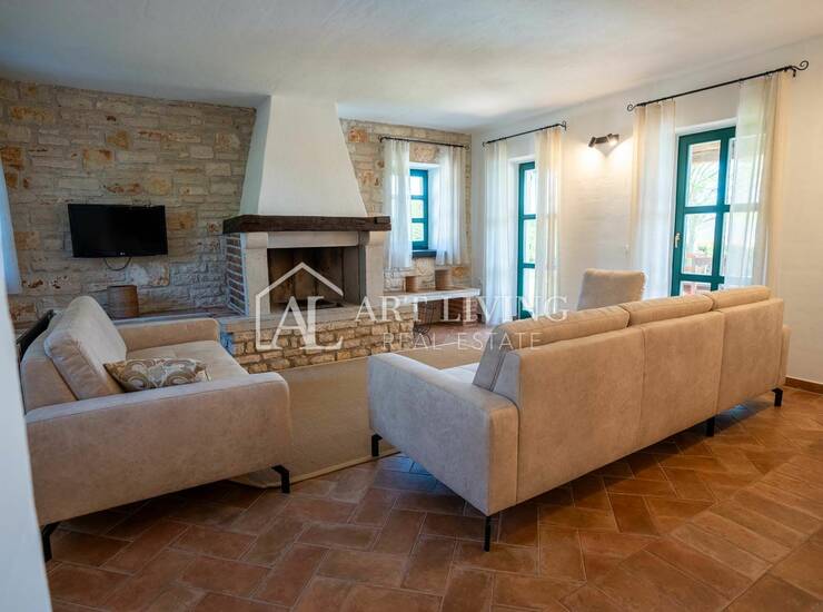 Svijetao i prozračan dnevni prostor koncipiran je kao otvorena cjelina koja povezuje potpuno opremljenu kuhinju, blagovaonicu i ugodan dnevni boravak s kaminom obloženim dekorativnim kamenom. Ovaj prostor prirodno se nastavlja na natkrivenu terasu s koje se pruža lijep pogled na sunčalište i bazen – savršeno mjesto za odmor tijekom cijelog dana.