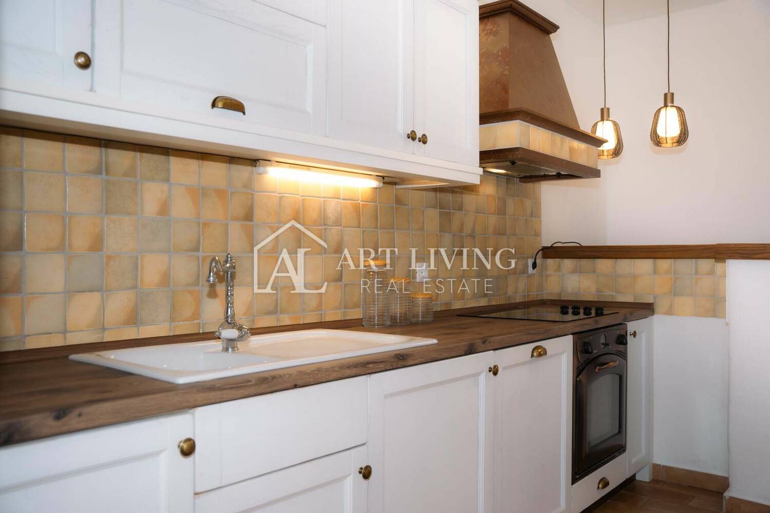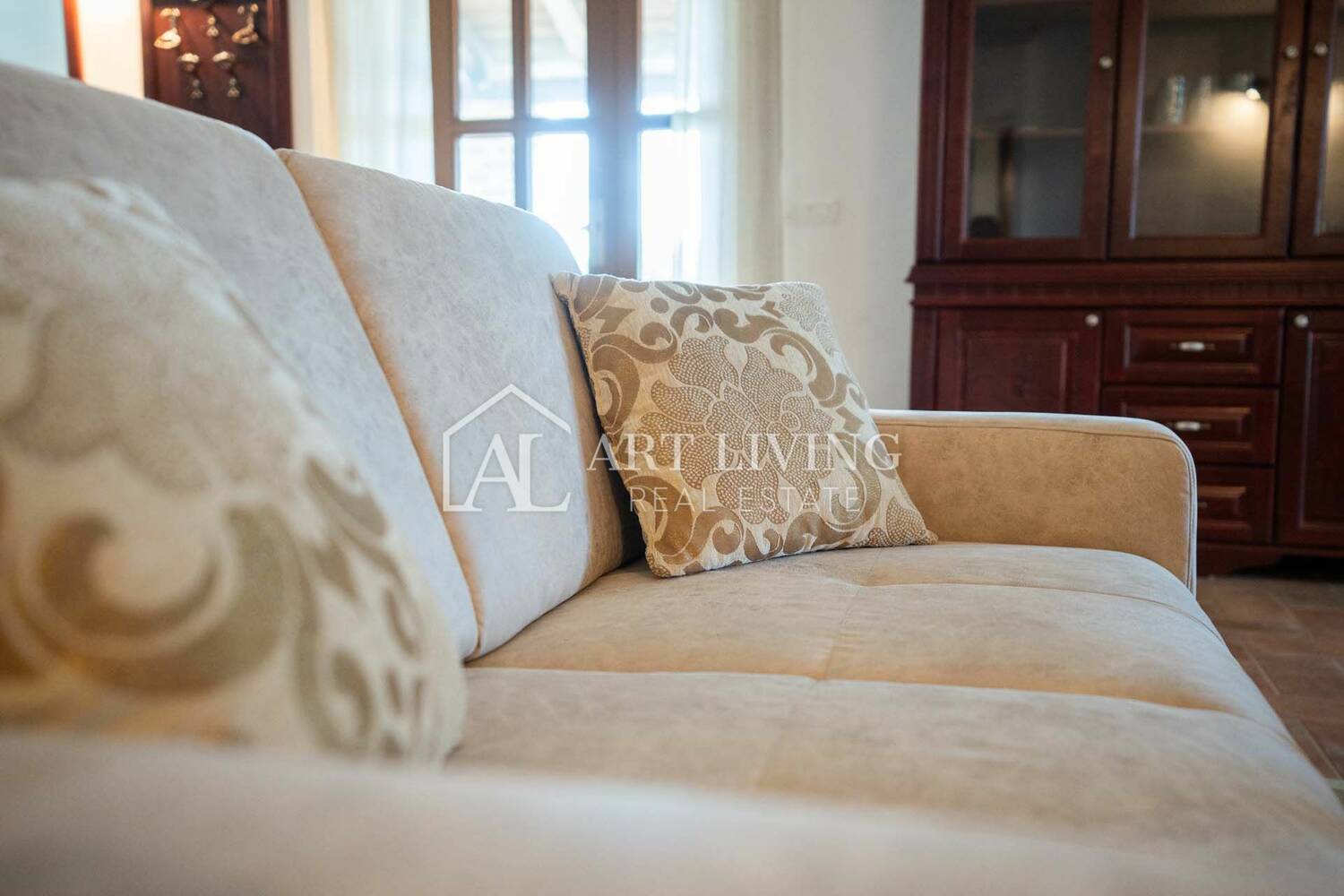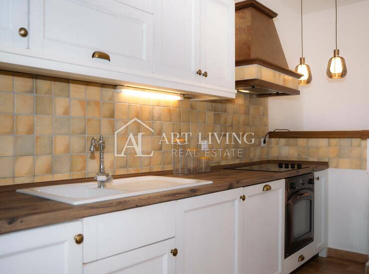Villa se proteže na dvije etaže, prizemlje i kat, ukupne površine 256 m2, i odiše toplinom zahvaljujući pažljivo biranom rustikalnom namještaju izrađenom od hrasta