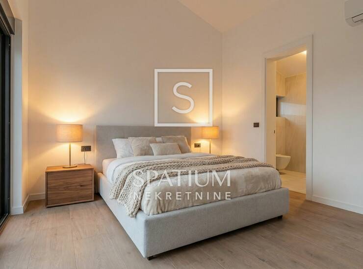 Kuća ima šarmantan, univerzalni stil s dozom luksuzna koji nas dočekuje već na samom ulazu u kuću. Velika, masivna hrastova vrata u kombinaciji sa aluminijem punim profilom protežu od poda do stropa - ostavljaju fantastičan prvi dojam.