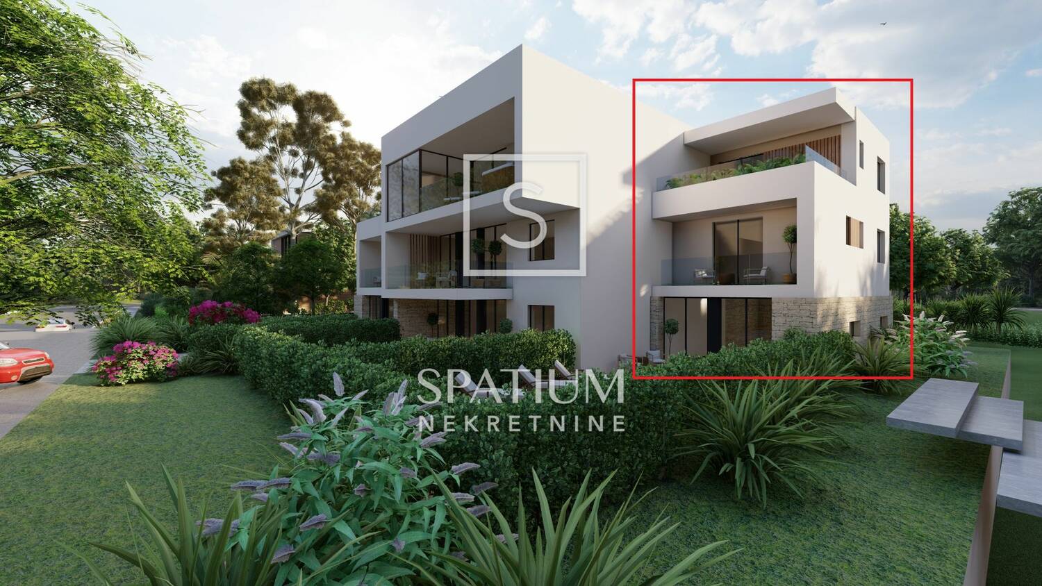 Unutarnje stubište vodi na prvi kat, gdje se nalaze dvije spavaće sobe, svaka s vlastitom kupaonicom, i natkrivena terasa tlocrtne površine 7 m2. Na drugom katu nalazi se treća spavaća soba, kupaonica i djelomično natkrivena terasa s prekrasnim pogledom na more.